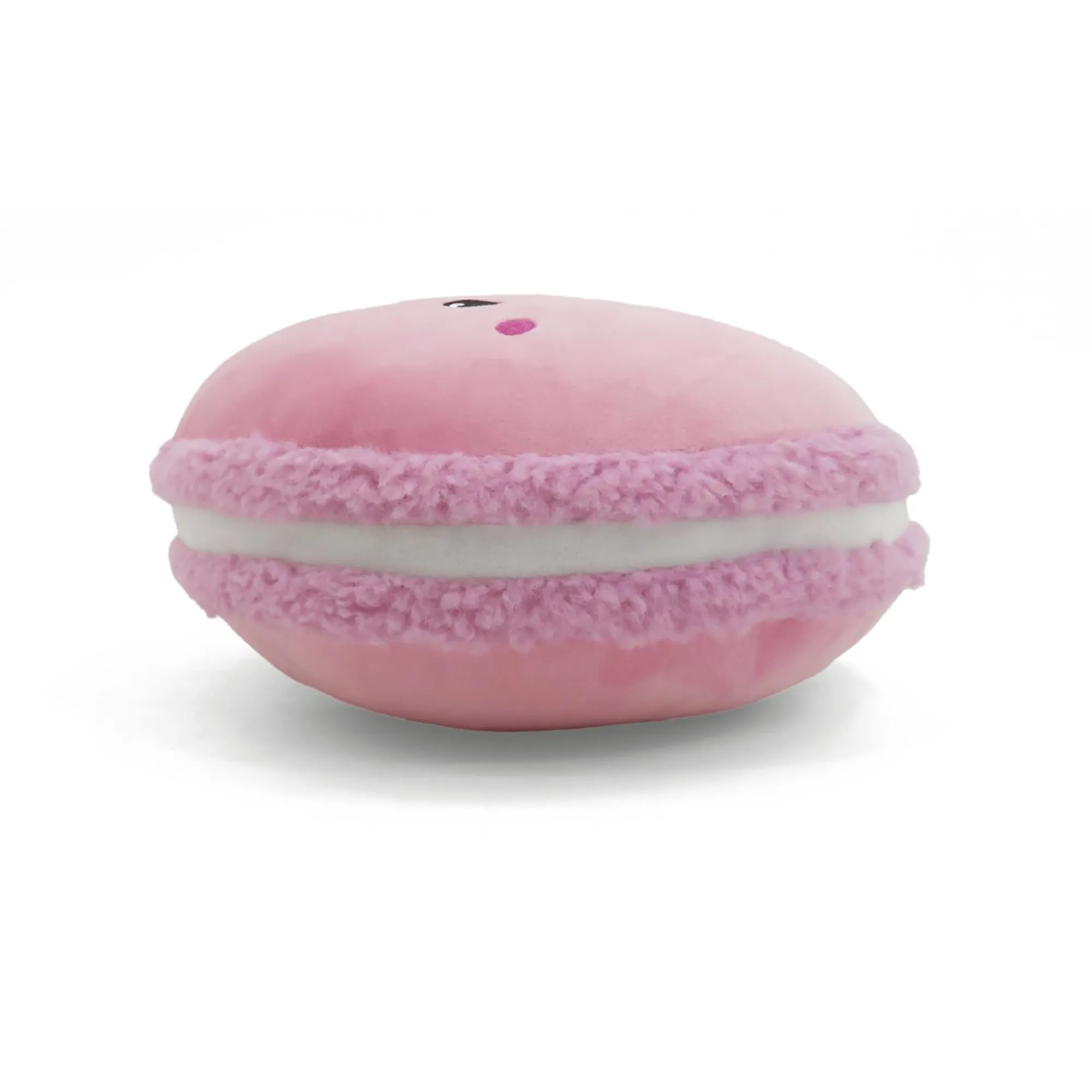 Un dolcetto di pasticceria rosa fragola, ripieno di crema e una faccina sorridente ricamata.