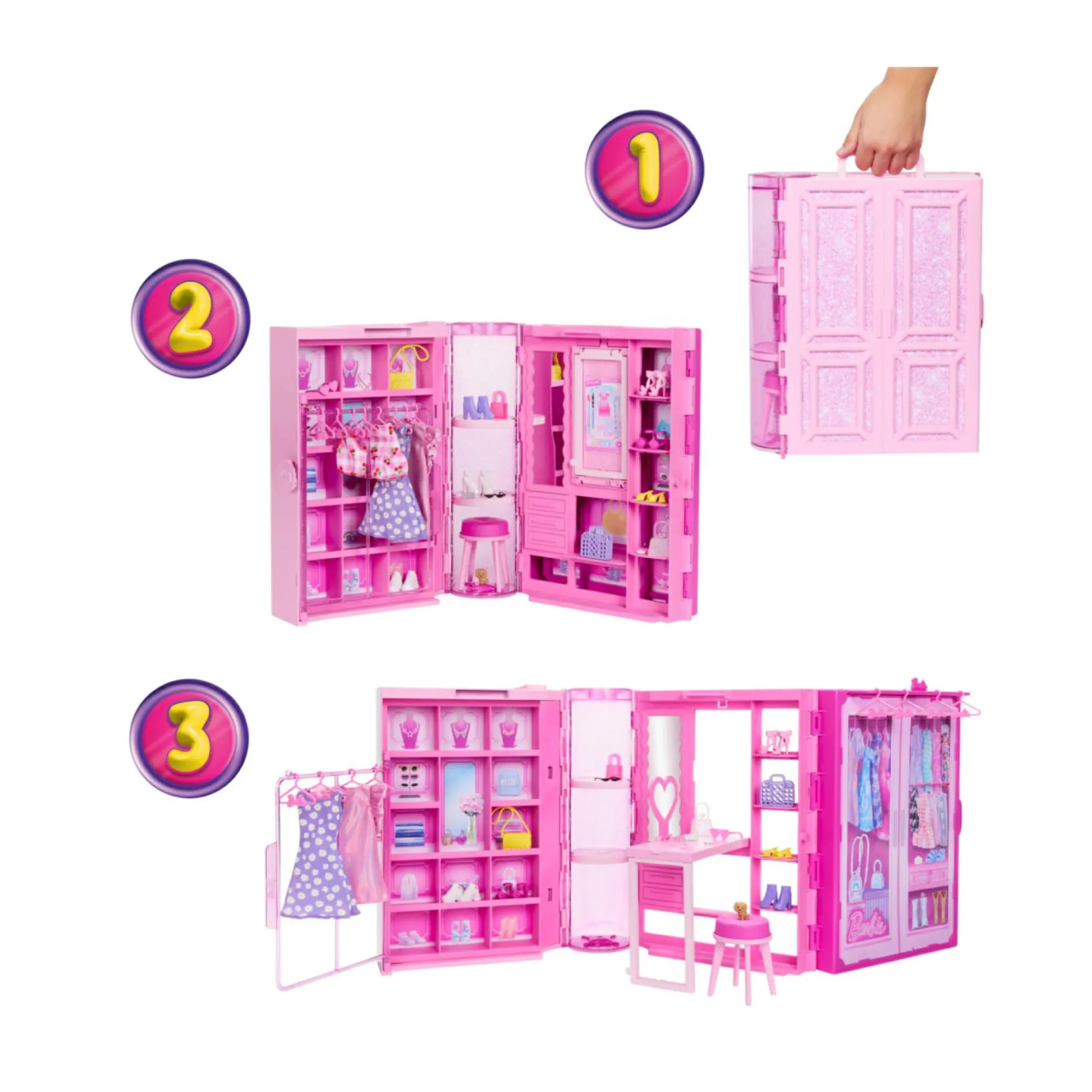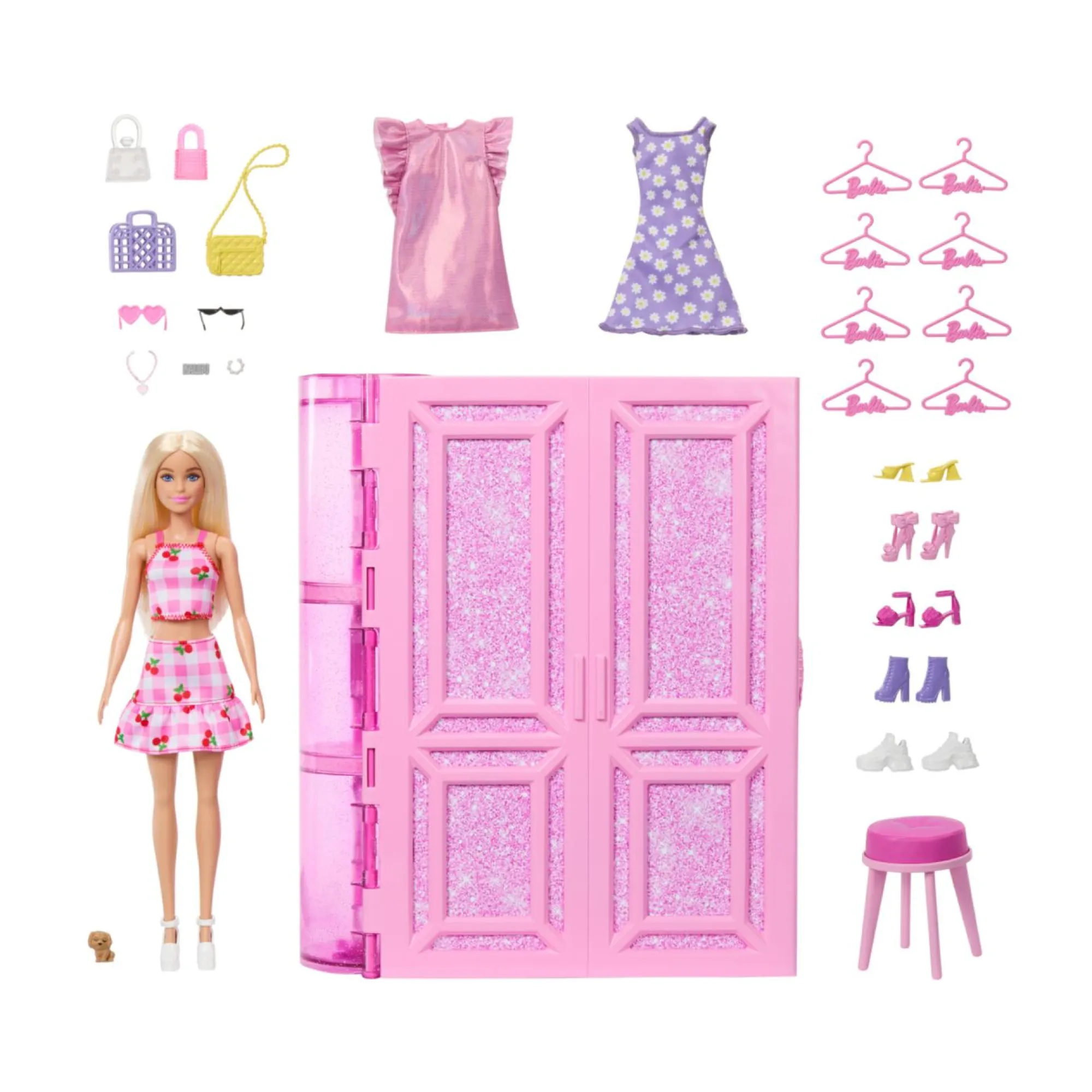 Il guardaroba rosa glitterato si apre su un playset da 91 cm con una bambola Barbie, 25+ pezzi, 20+ scomparti, 2 appendiabiti, una parete per scarpe.