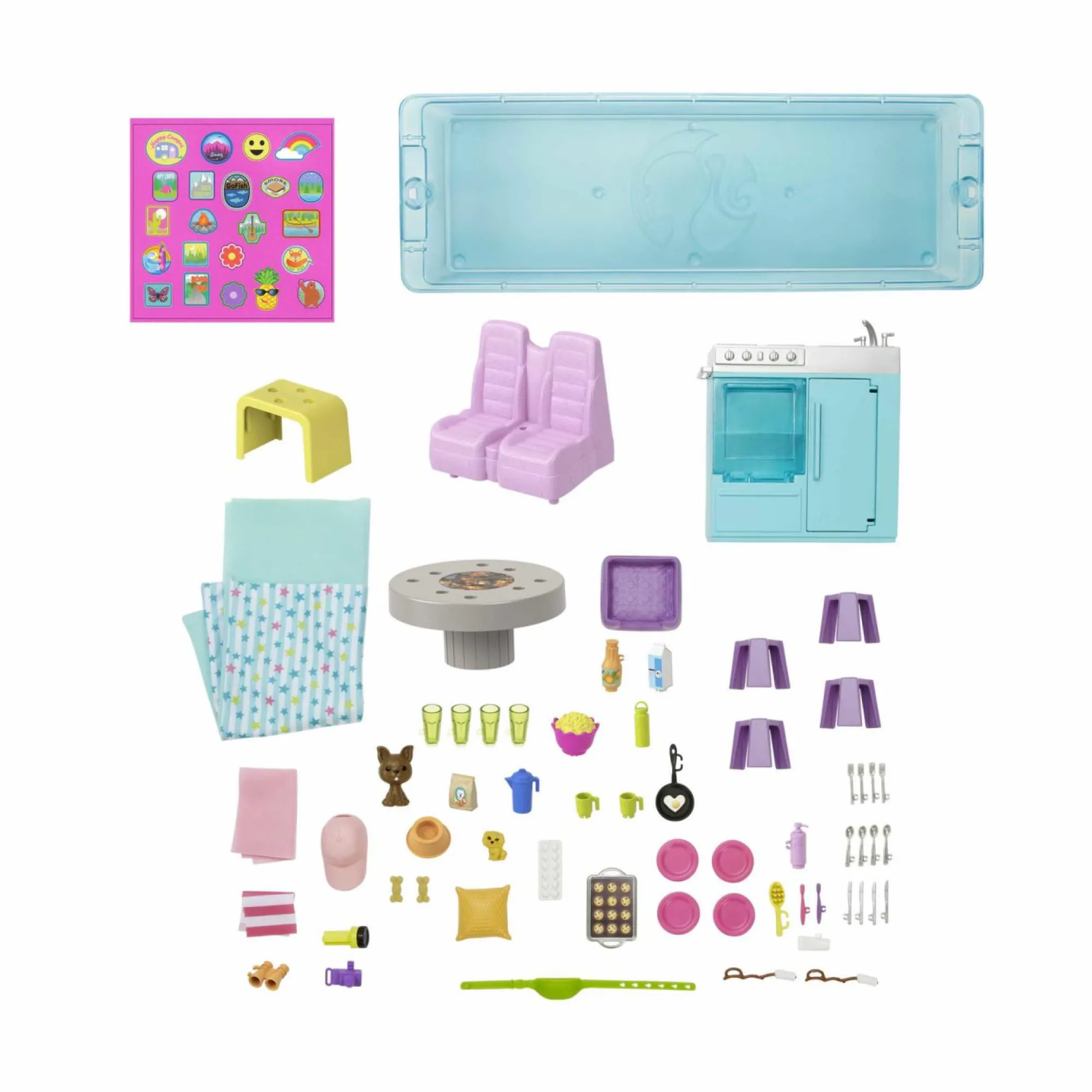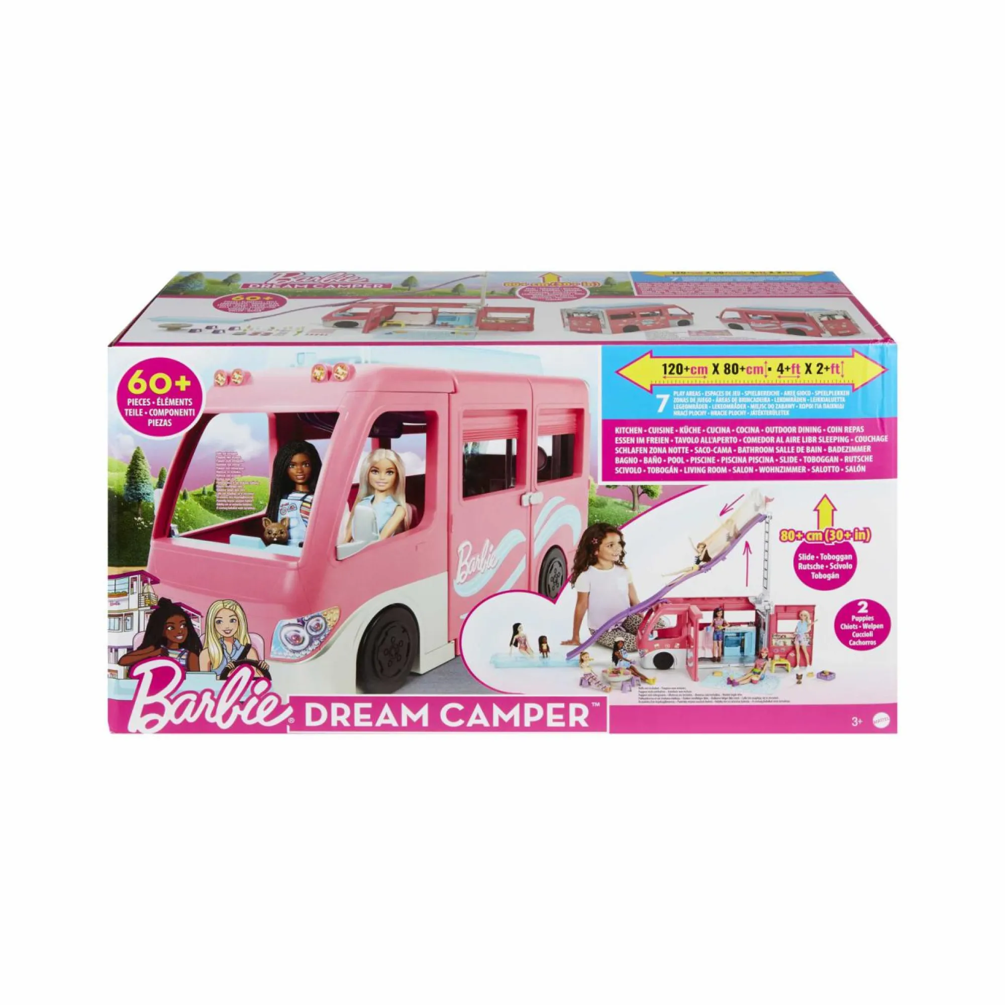 Percorri la strada dell’avventura con il Camper dei Sogni di Barbie, dotato di un fantastico scivolo, 7 aree gioco e tutto ciò di cui hai bisogno per giocare e immaginare un’esclusiva gita in campeggio!