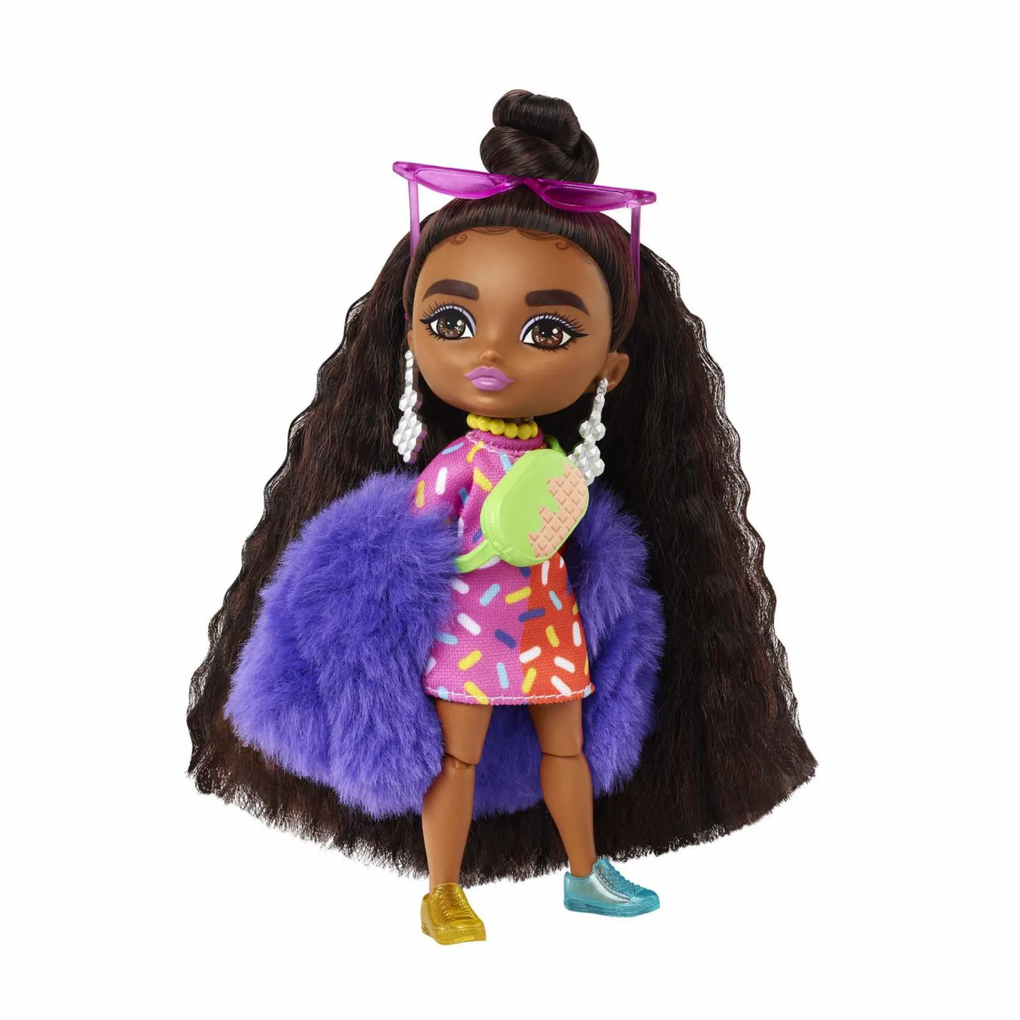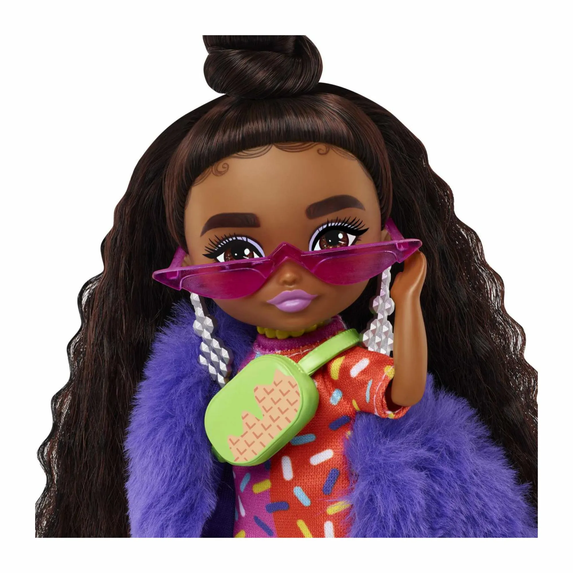 Questa bambola Barbie Extra Minis sfoggia capelli extra lunghi ondulati raccolti in uno chignon alto, un abito con motivo arcobaleno e una giacca di pelo viola extra stilosa.