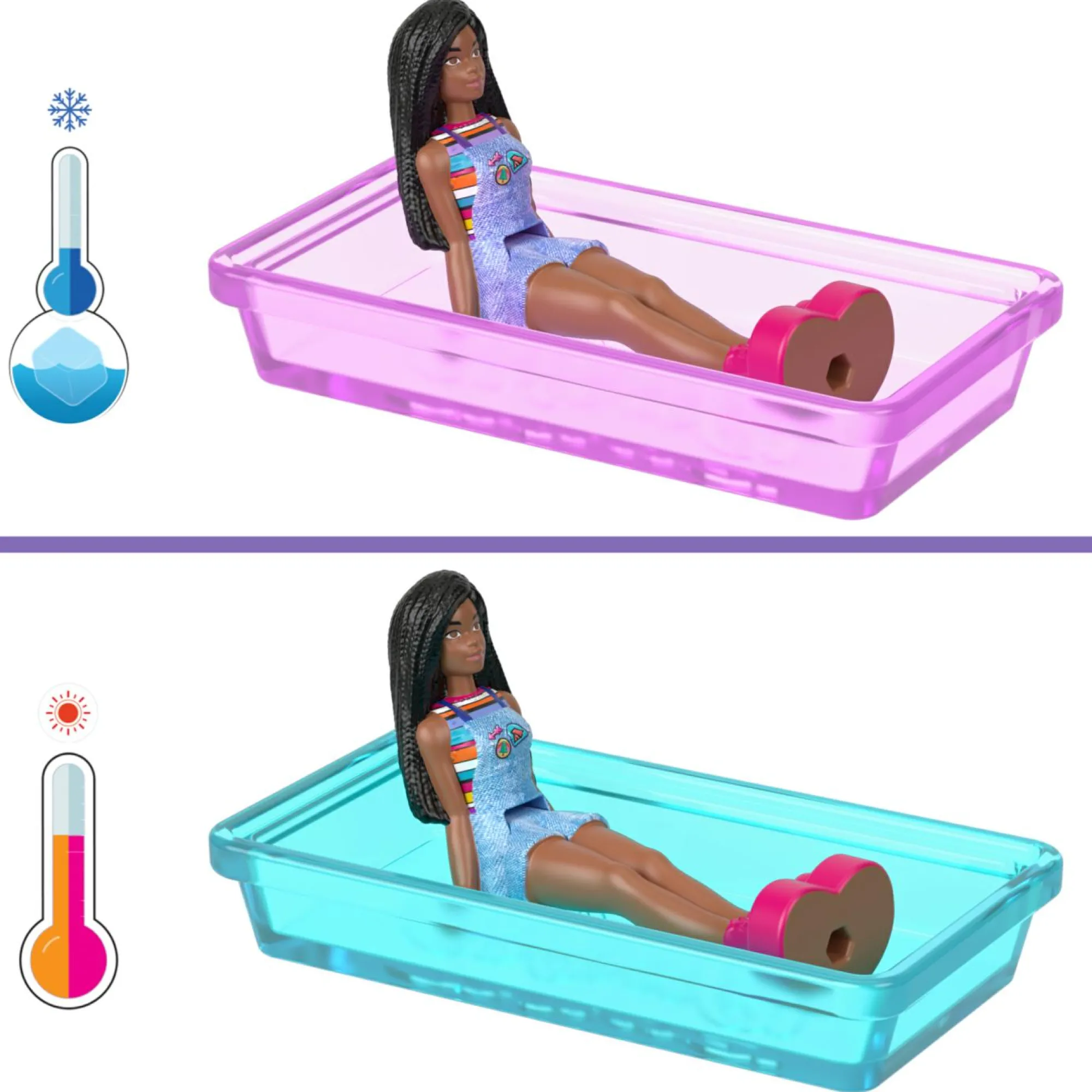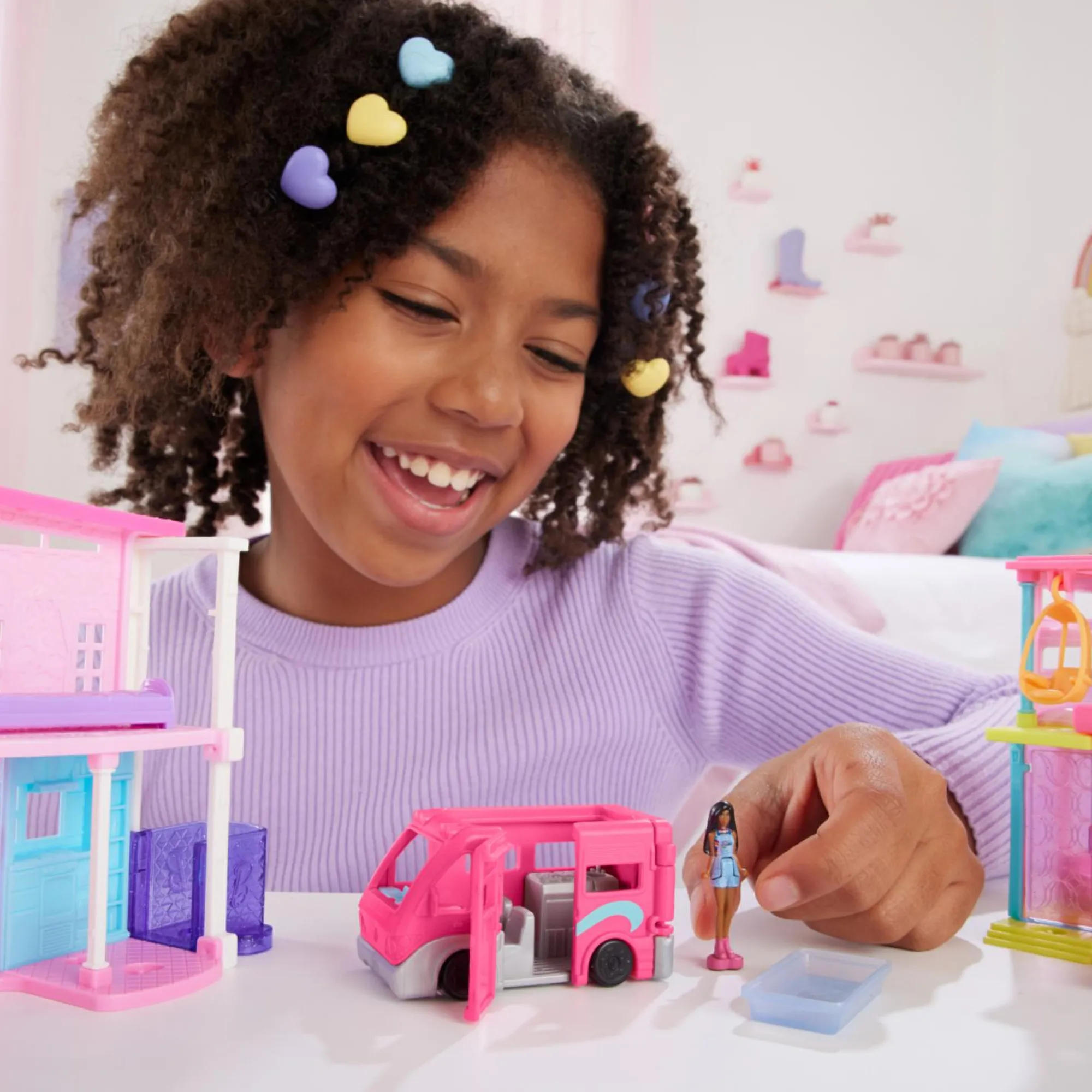 Questo playset include una riproduzione dell’iconico Camper dei sogni di Barbie con un emozionante momento cambia-colore e una bambola da 3,8 cm!