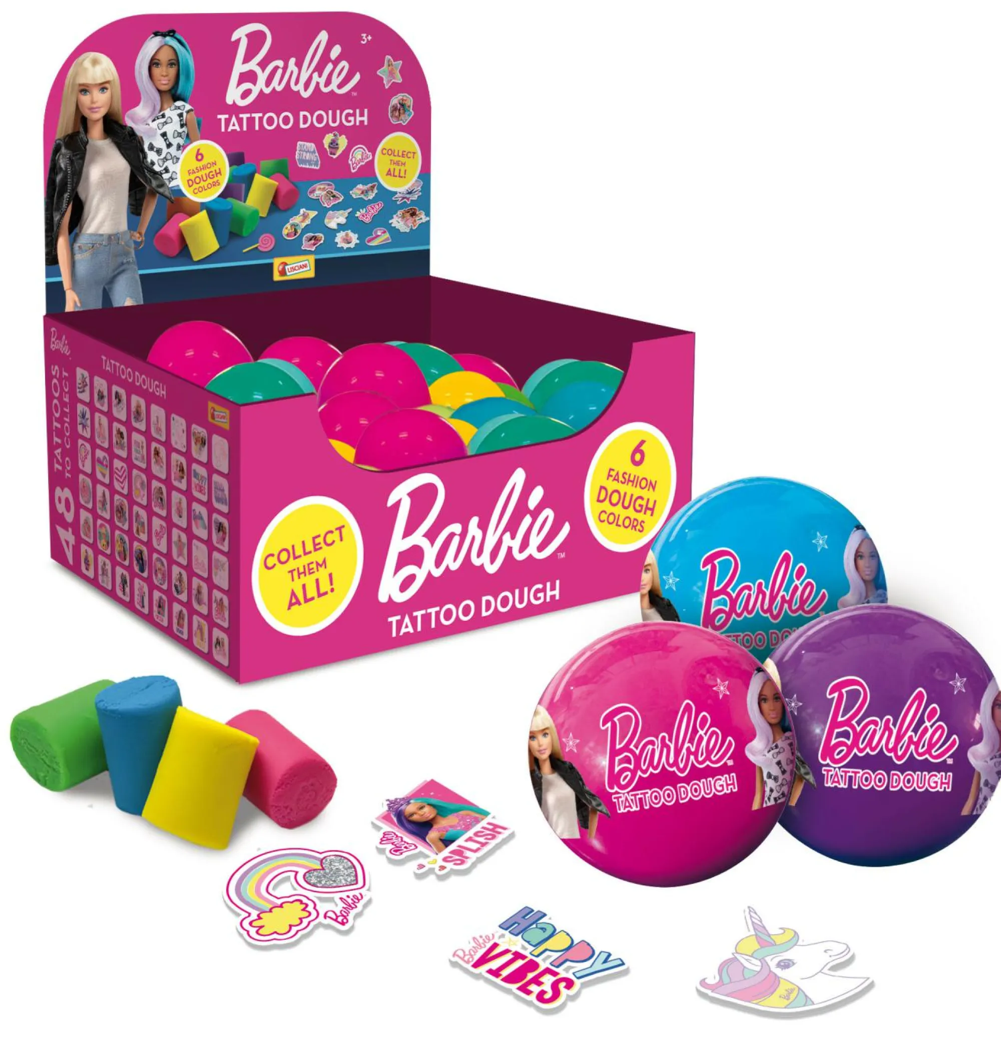 Tantissimi tattoo di Barbie da collezionare! – Con immagini fashion di Barbie! – Scegli i tuoi colori preferiti! – All’interno della pallina tattoo personalizzati e plastilina colorata. – In display da 48 palline colorate!