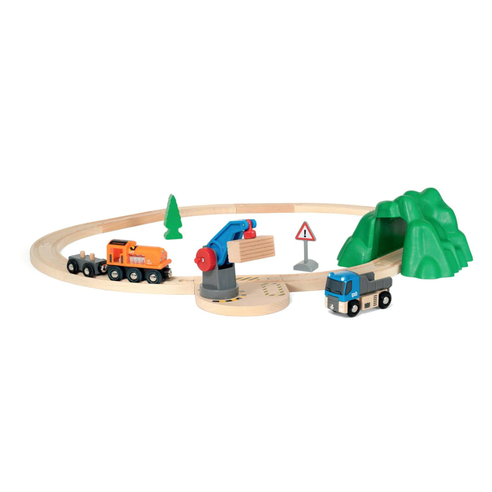 Inclusi: una gru, un camion, una locomotiva, un abete, un segnale e una montagna attraverso la quale sfrecciare