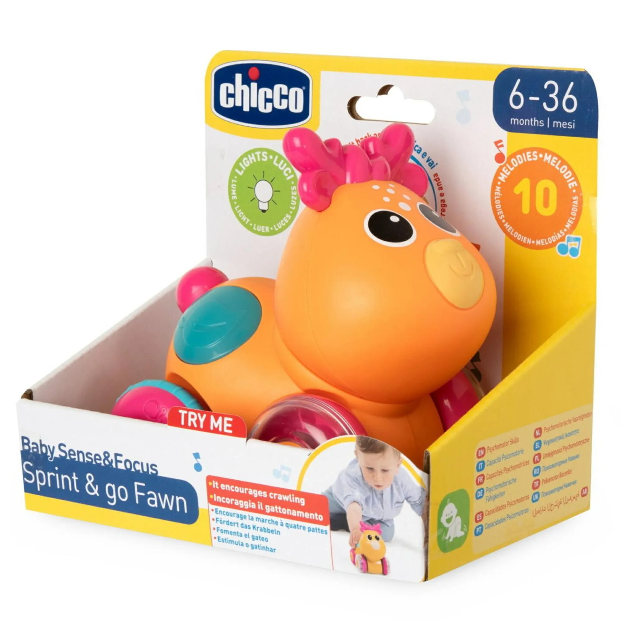 Cerbiatto elettronico: prende vita tirandolo indietro o girando la codina. Suoni, melodie e luci si animano ad ogni movimento. La testa del cerbiatto oscilla quando si muove.