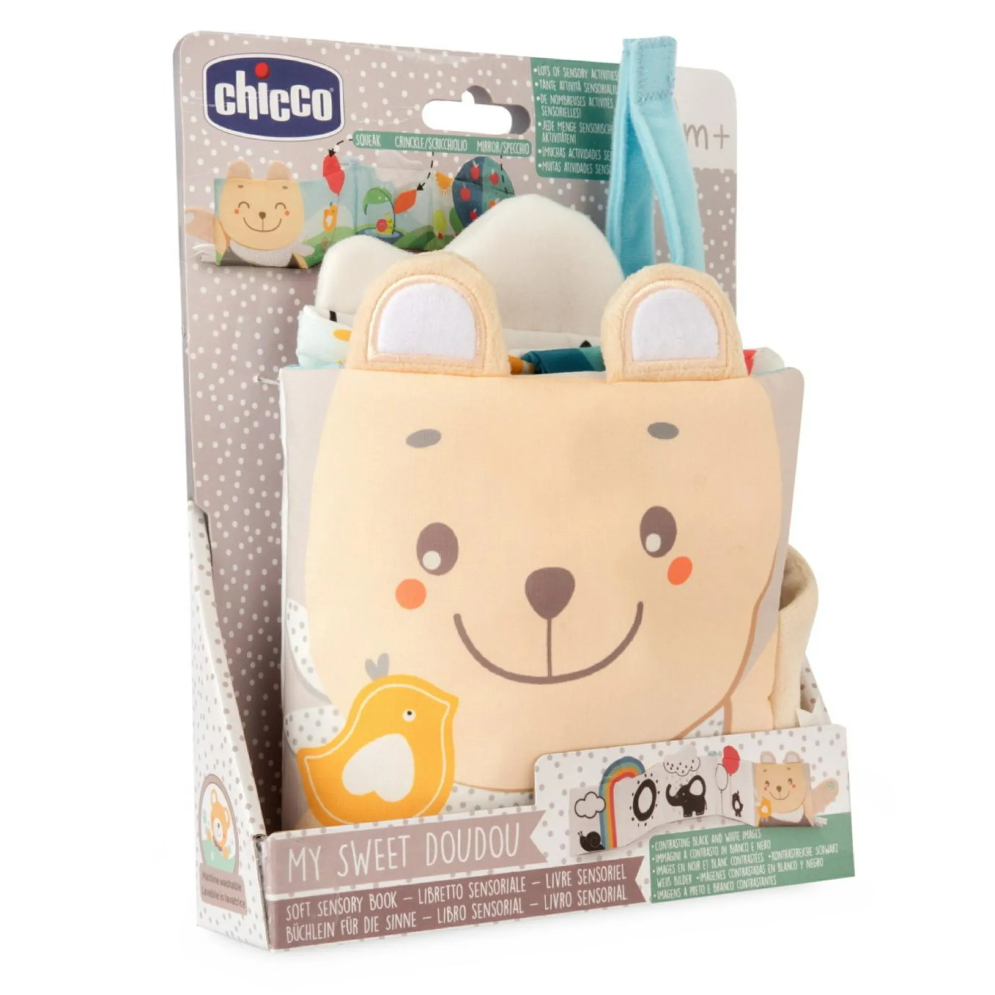 Libretto in tessuto morbido con immagini colorate e in bianco e nero, ideale per i neonati.