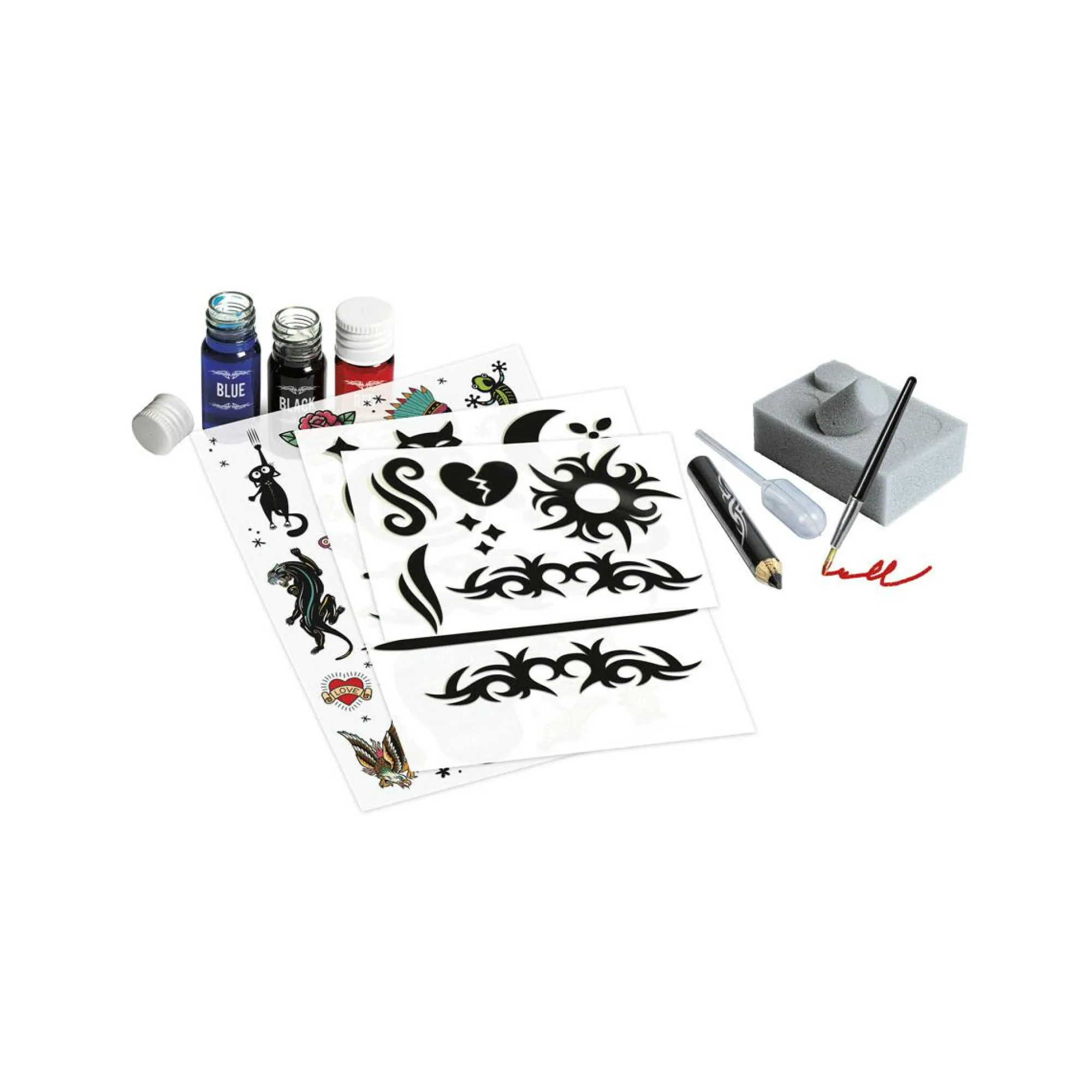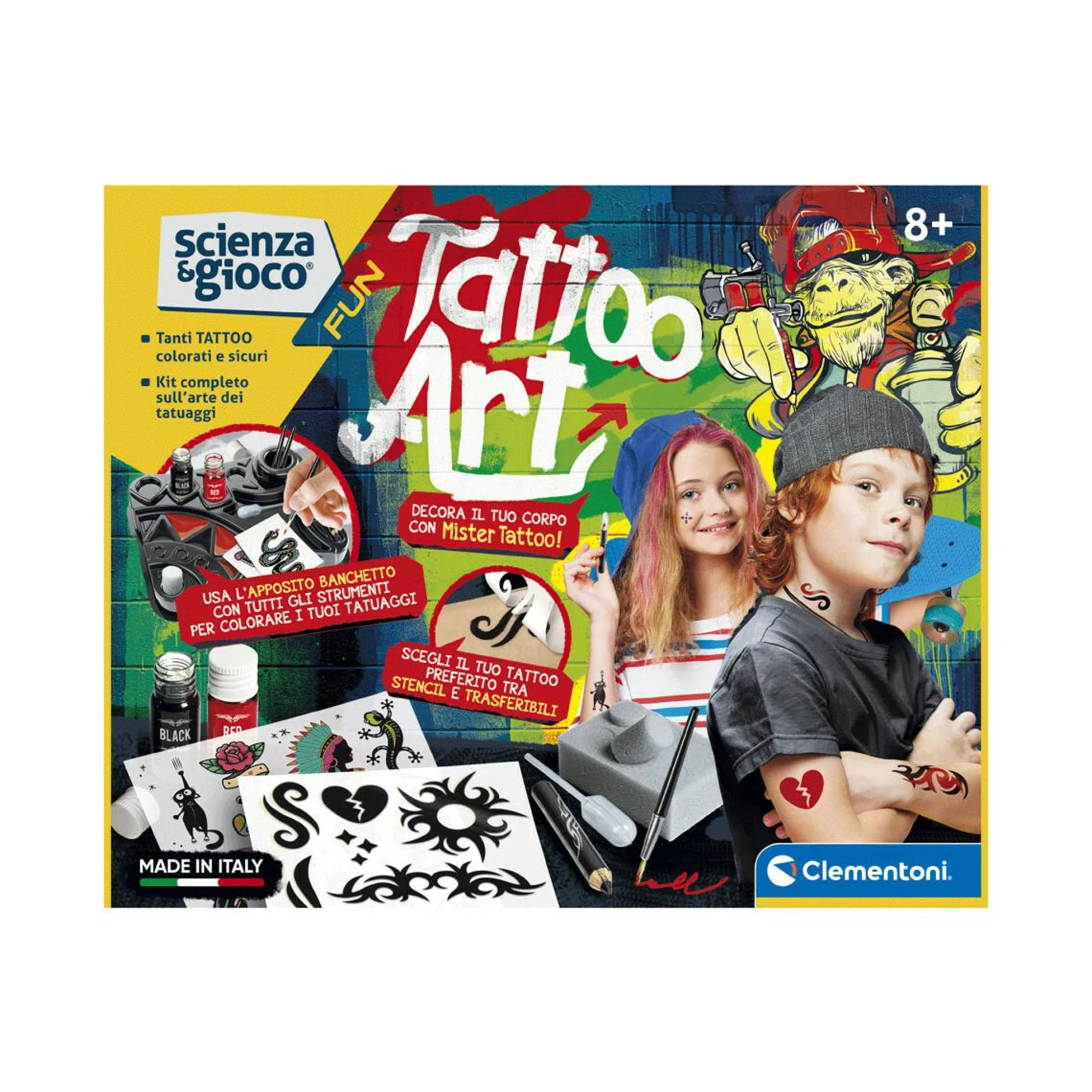 Un laboratorio, ma anche un incredibile set con tutto il necessario per realizzare tatuaggi alla moda! Contiene un banchetto da lavoro, pennelli, coloranti liquidi e stencil per realizzare tatuaggi a mano libera proprio come un vero tatuatore! Il manuale spiega passo passo come realizzare i tatuaggi, guidando il bambino in un’esperienza di gioco divertente e coinvolgente