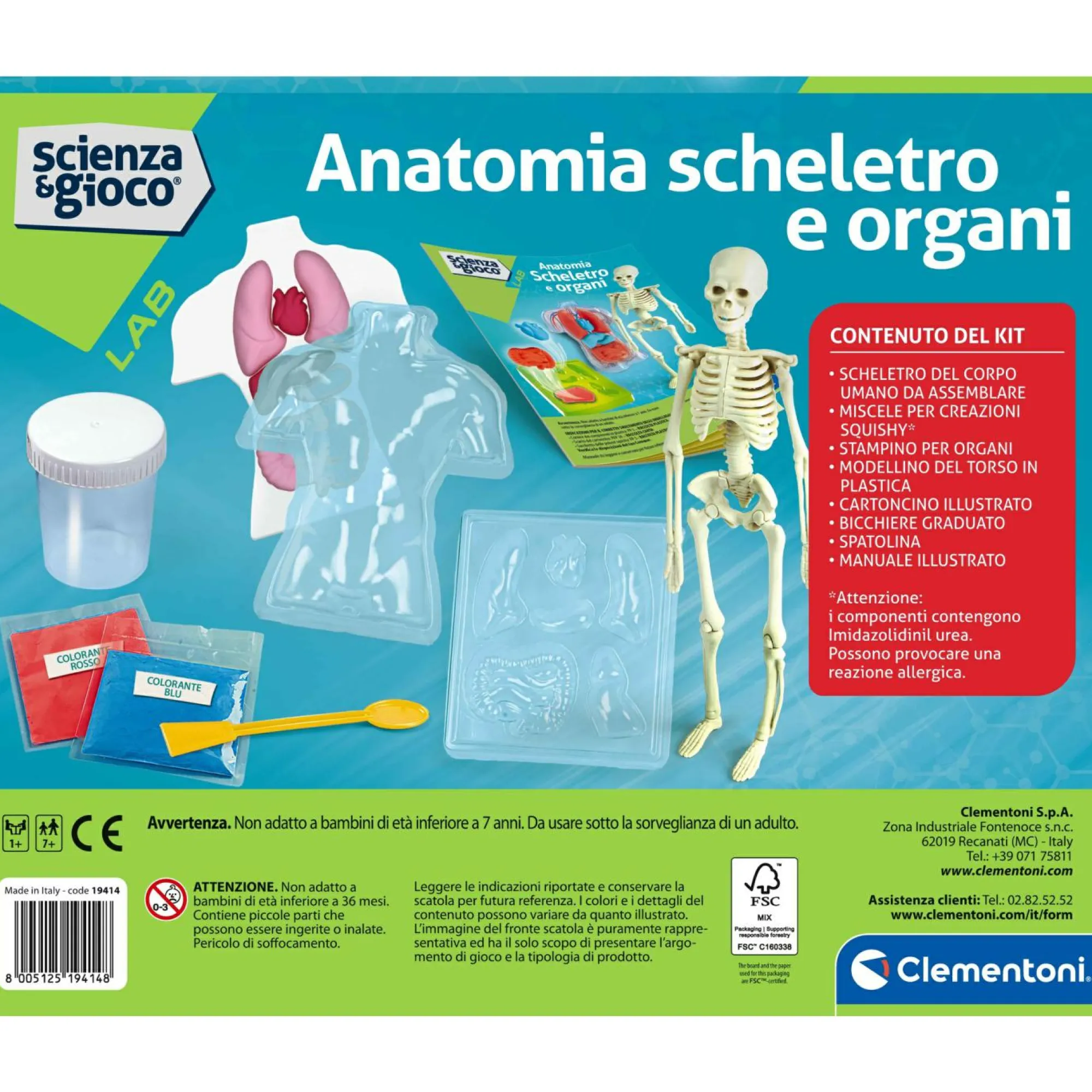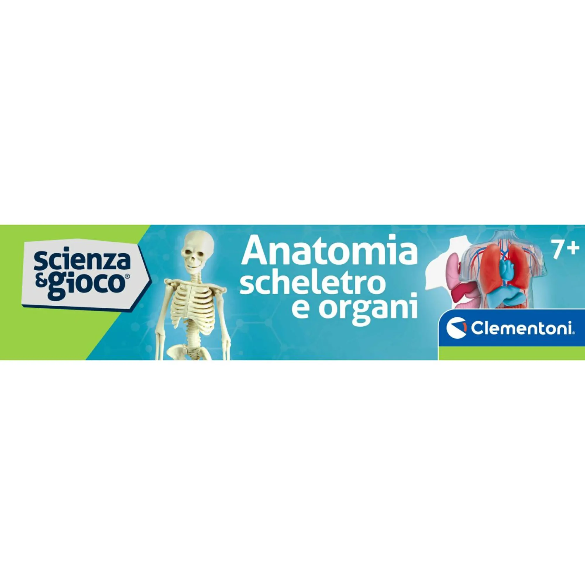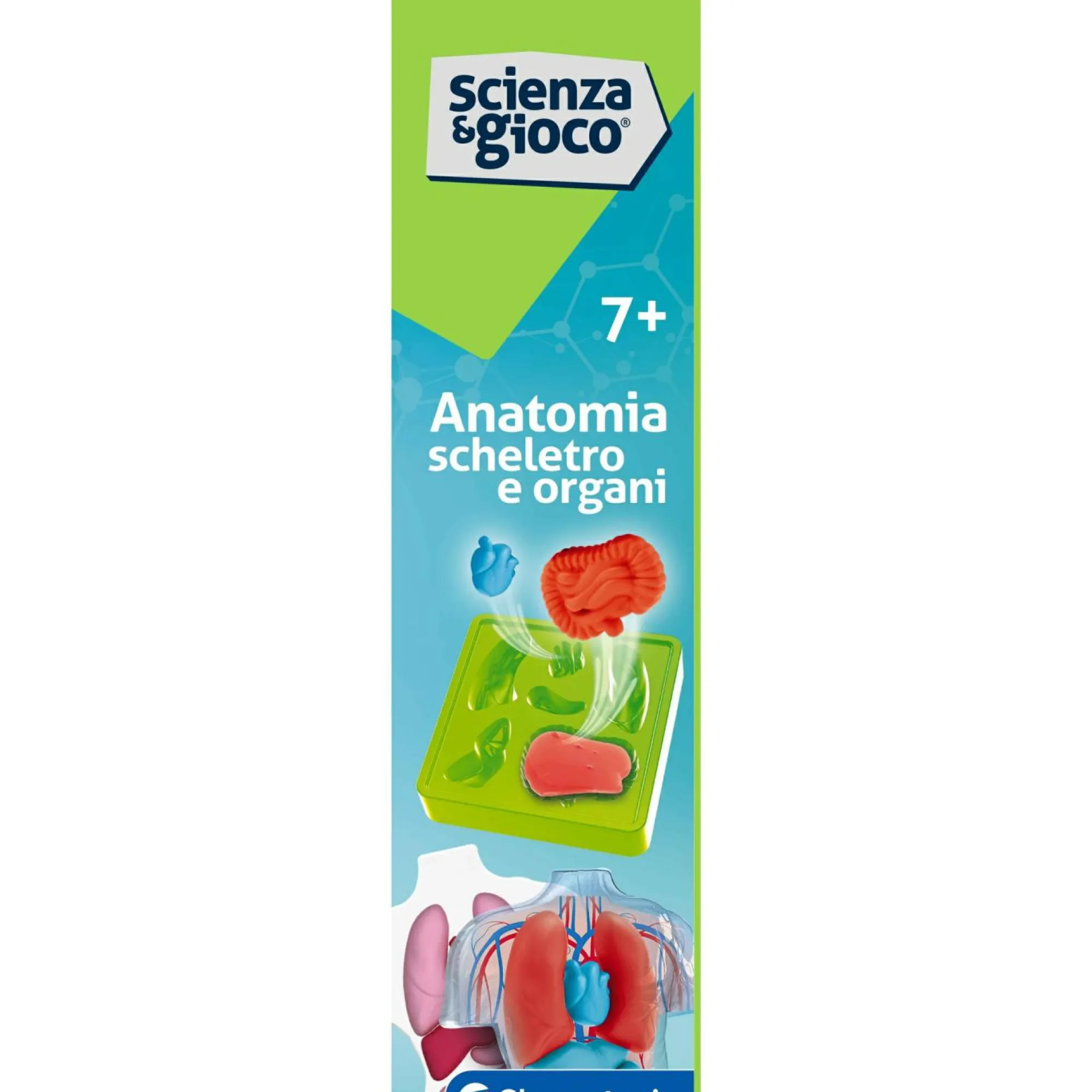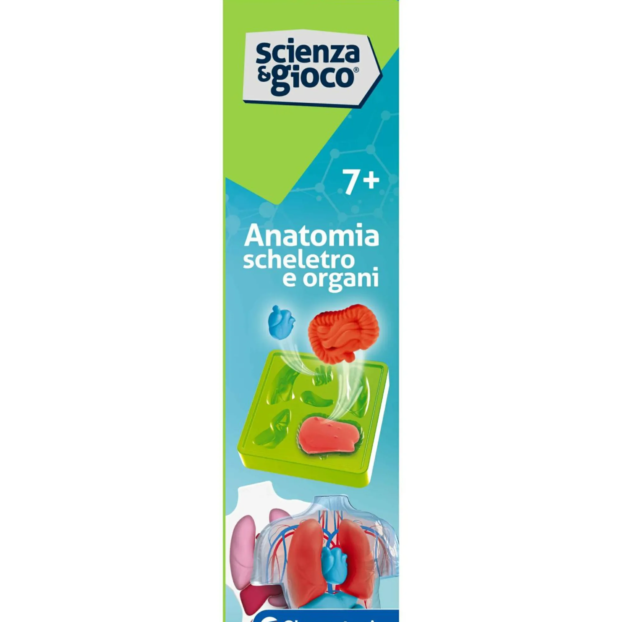 Include una fedele riproduzione in plastica dello scheletro umano e dei sistemi anatomici in cartone per studiare il corpo umano e posizionare correttamente gli organi creati.