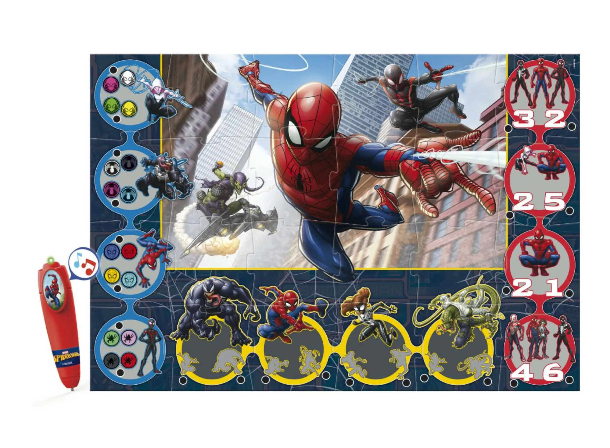 Dopo aver composto l’immagine del puzzle, e incastrati nella corretta posizione i tasselli delle forme, il bambino potrà giocare con la penna elettronica di Spiderman, risolvendo divertenti quiz su forme e colori.