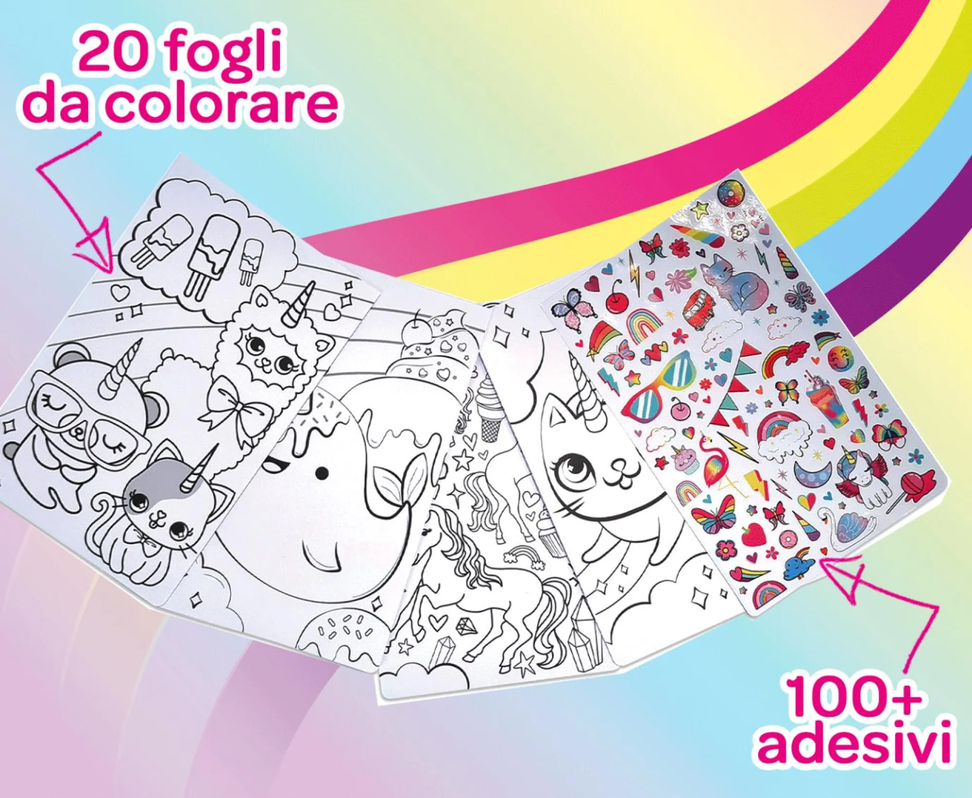 ALBUM SET UNICORNO: un simpatico album da colorare popolato da unicorni e creature fantastiche con un scintillante corno che appare su ogni pagina
