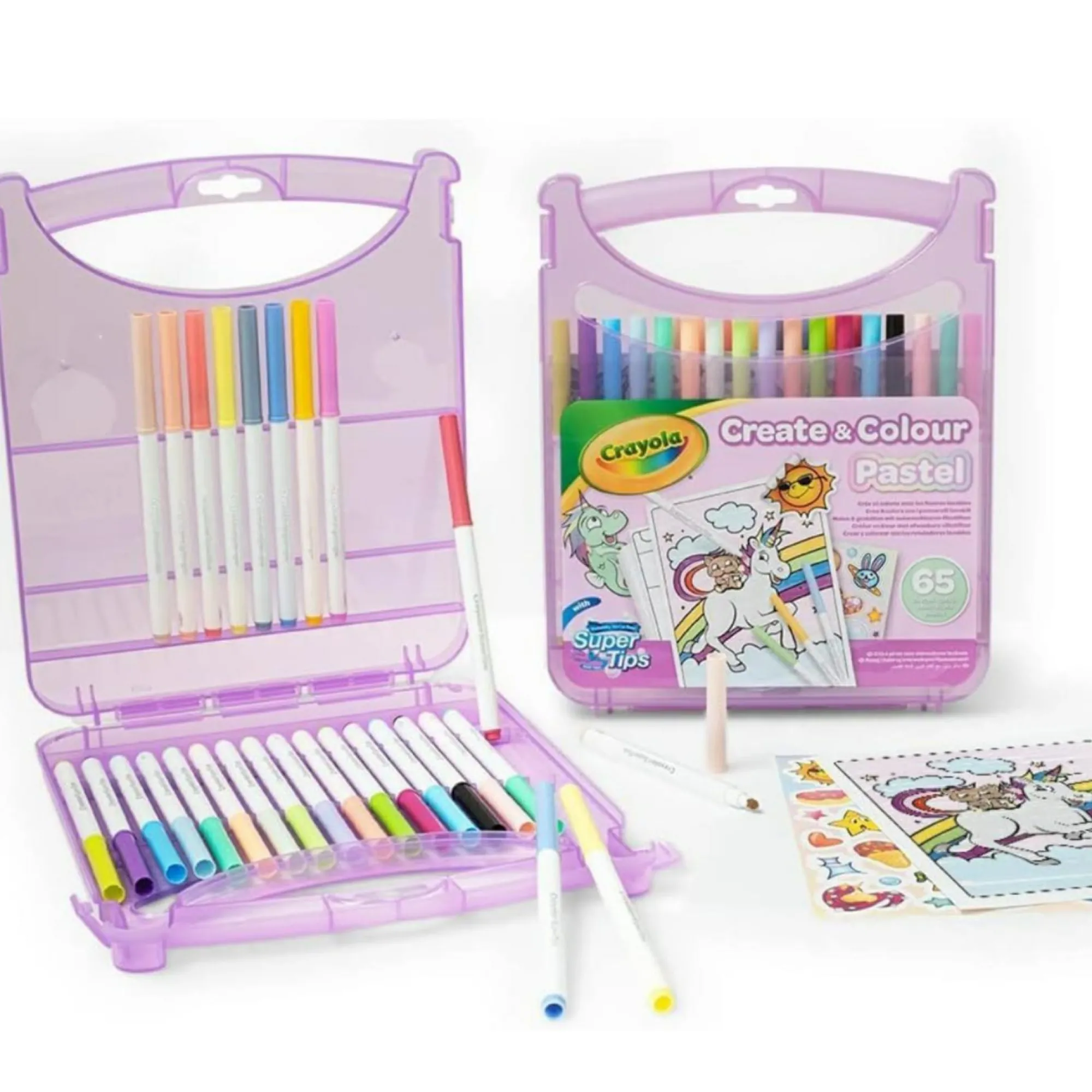 KIT CREATIVO: 25 pennarelli SuperTips lavabili, 20 pagine da colorare, 18 fogli bianchi, 5 fogli di adesivi all’interno di una pratica valigetta in plastica con maniglia