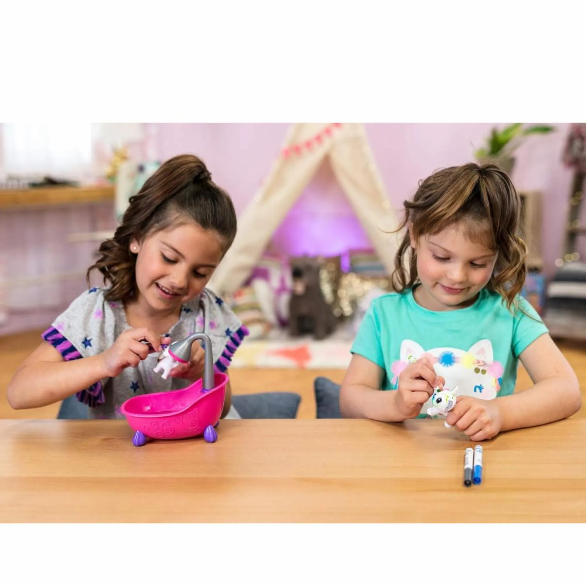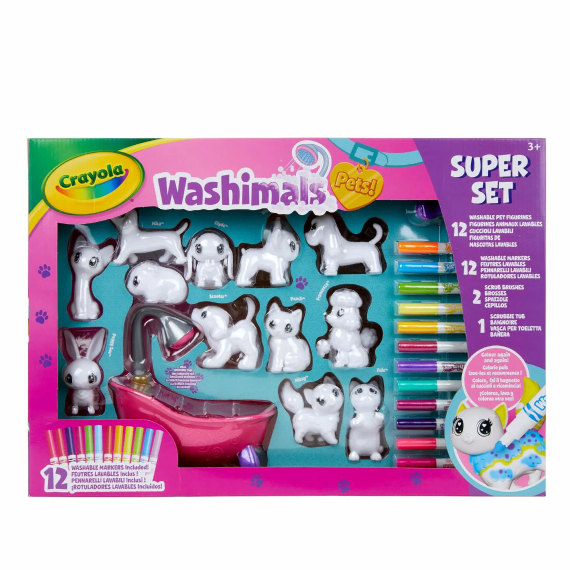 COLORA, LAVA, RICOLORA: decora e personalizza i cuccioli Washimals con i tanti pennarelli poi fai loro il bagnetto e ricomincia da capo; sbizzarrisciti a creare pattern con sfumature sempre diverse per ore e ore di divertimento creativo!
