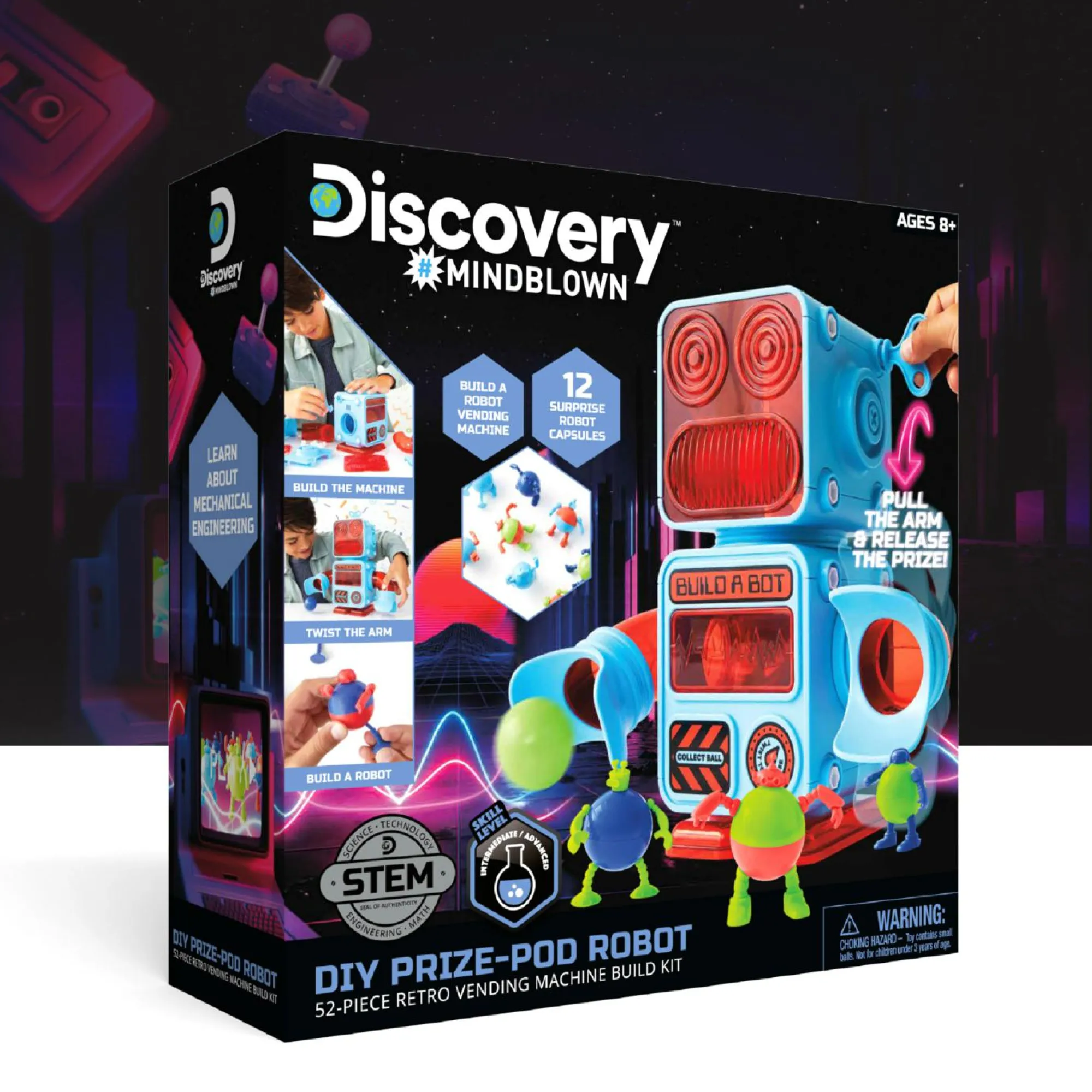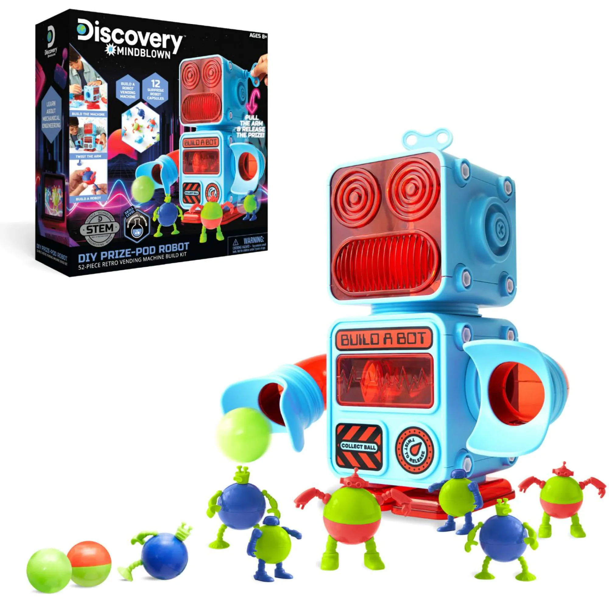 Kit per costruire una macchina distributrice di Discovery Mindblown, con 52 pezzi per stimolare la creatività e l’inventiva dei bambini.