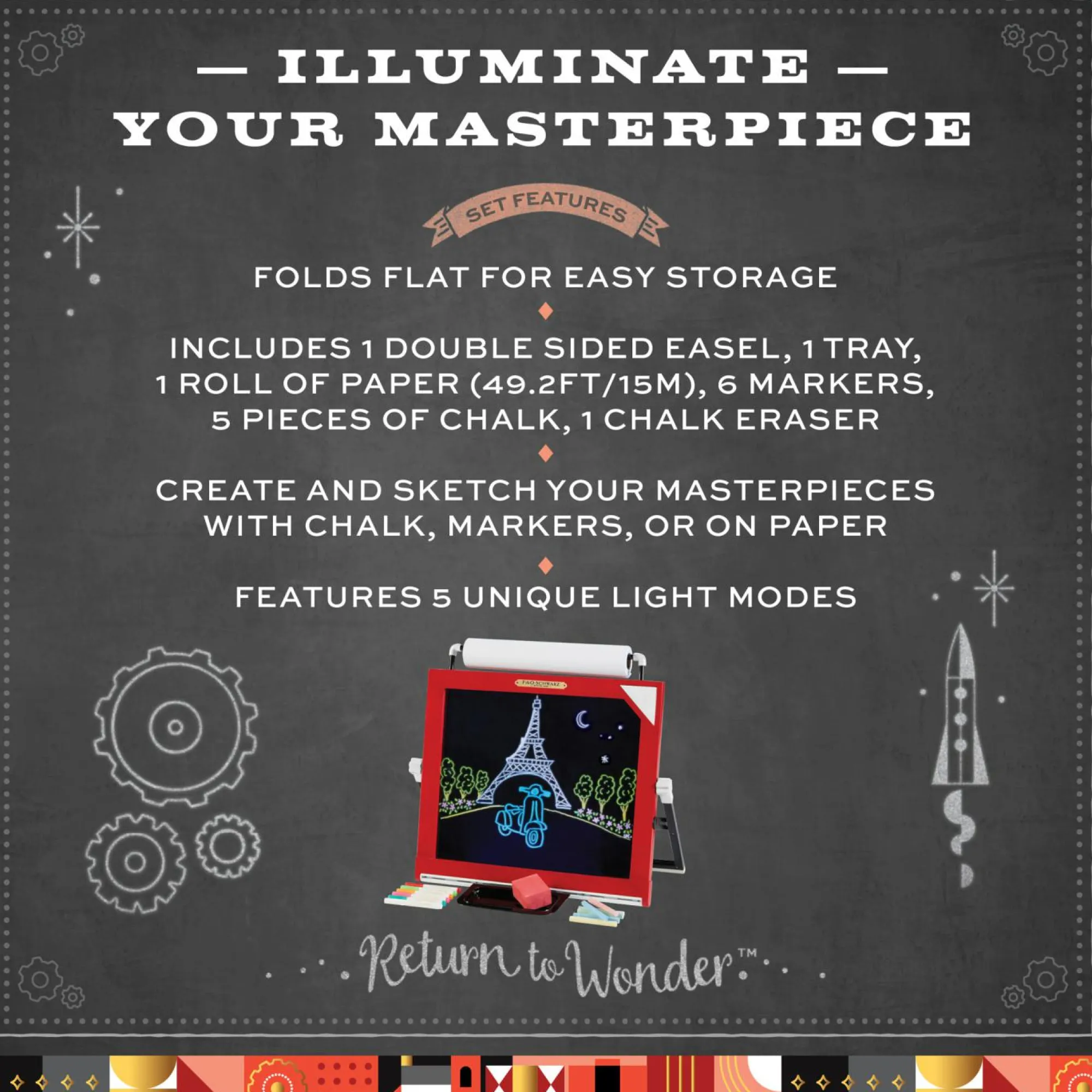 Questa lavagnetta da tavolo LED 3 in 1 comprende pennarelli, gessetti, gomma e 15 metri di carta da disegno. Il rotolo di carta si monta sopra e può essere tirato giù su entrambi i lati del cavalletto per disegnare con la carta. La luce LED illumina i tuoi disegni, dandogli un effetto ancora più brillante!