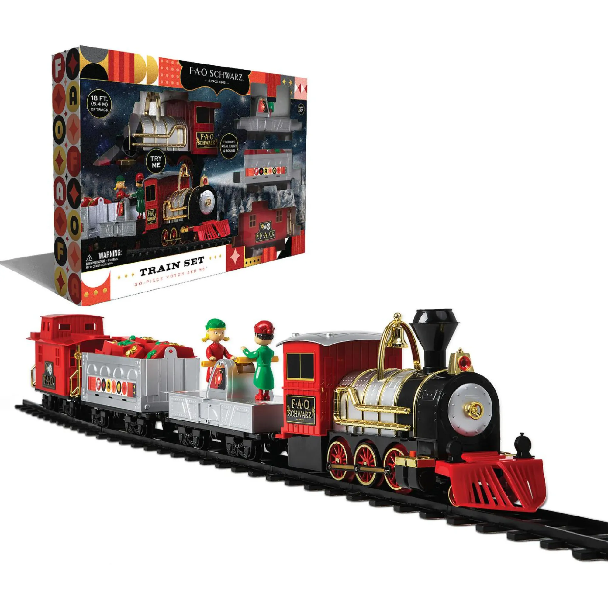 Rivisitazione del classico trenino telecomandato FAO Schwarz. Divertiti ancora di più e parti per un magico viaggio senza fine! Il set ferroviario è dotato di 4 vagoni unici ispirati a un vero treno a vapore, con elementi e personaggi animati. La locomotiva emette il tipico “ciuf-ciuf”, come un vero treno! L’illuminazione a LED crea un’atmosfera suggestiva, ti basterà un cappello per sentirti un vero capo-treno. I 30 binari componibili permettono di creare una pista lunga fino a 5,4 metri, per divertirti a costruire piste sempre diverse insieme a tutta la famiglia.