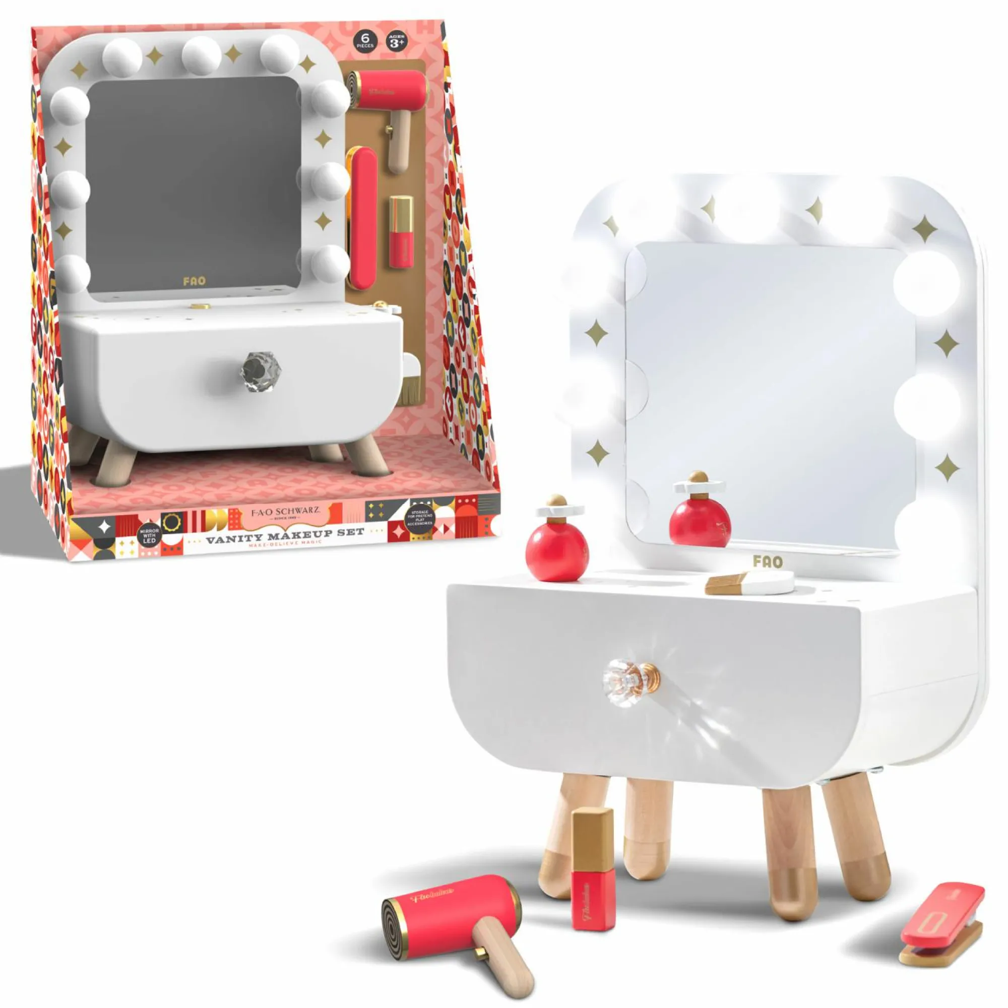 Il tavolo da trucco è illuminato da vivaci luci a LED.