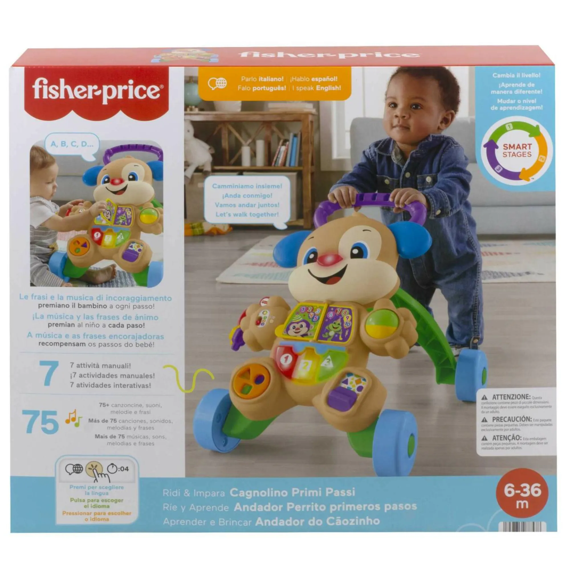 I 3 livelli Smart Stages con oltre 75 canzoni, suoni e frasi insegnano l’alfabeto, le forme, i colori, i numeri e parole in inglese (lingue supportate spagnolo e portoghese)