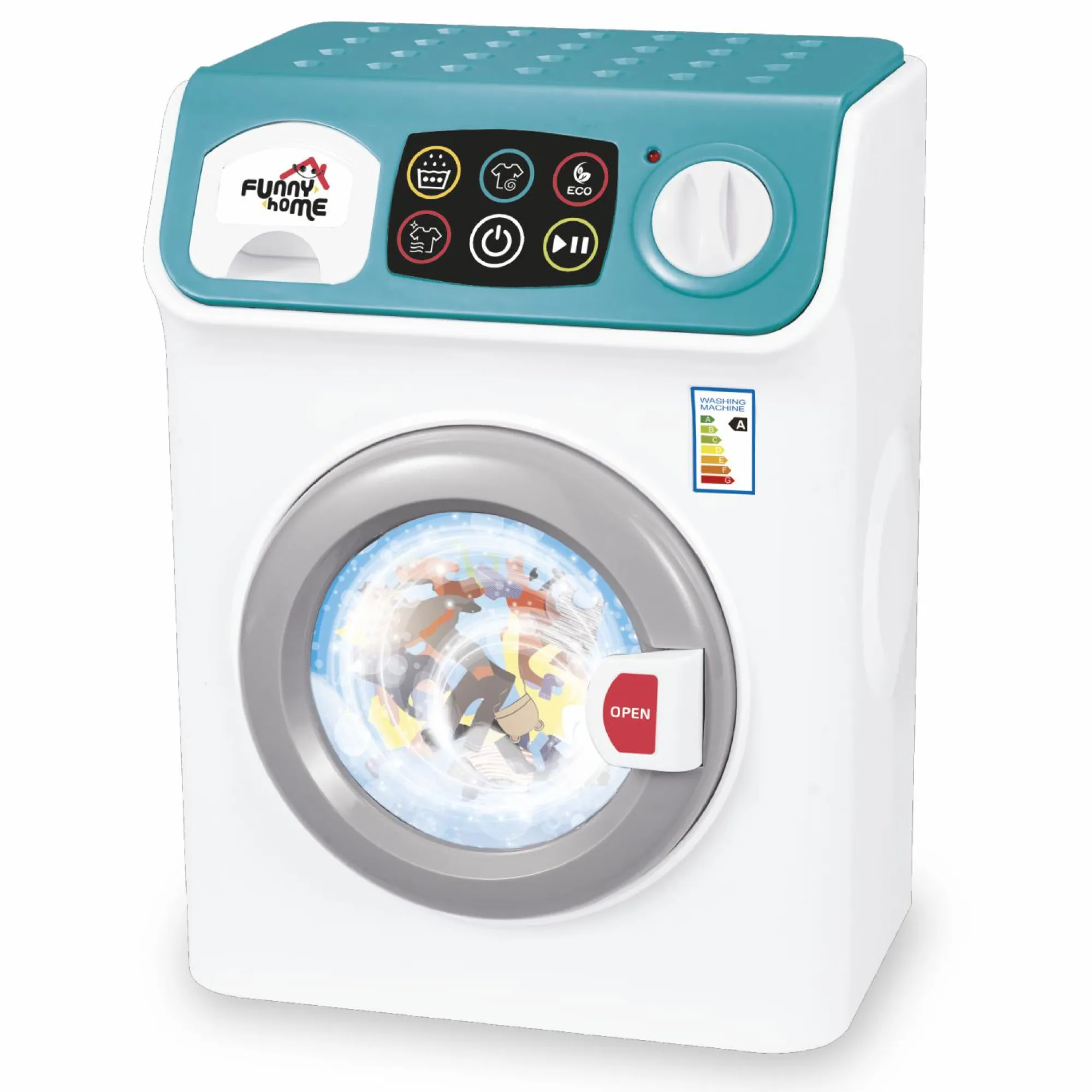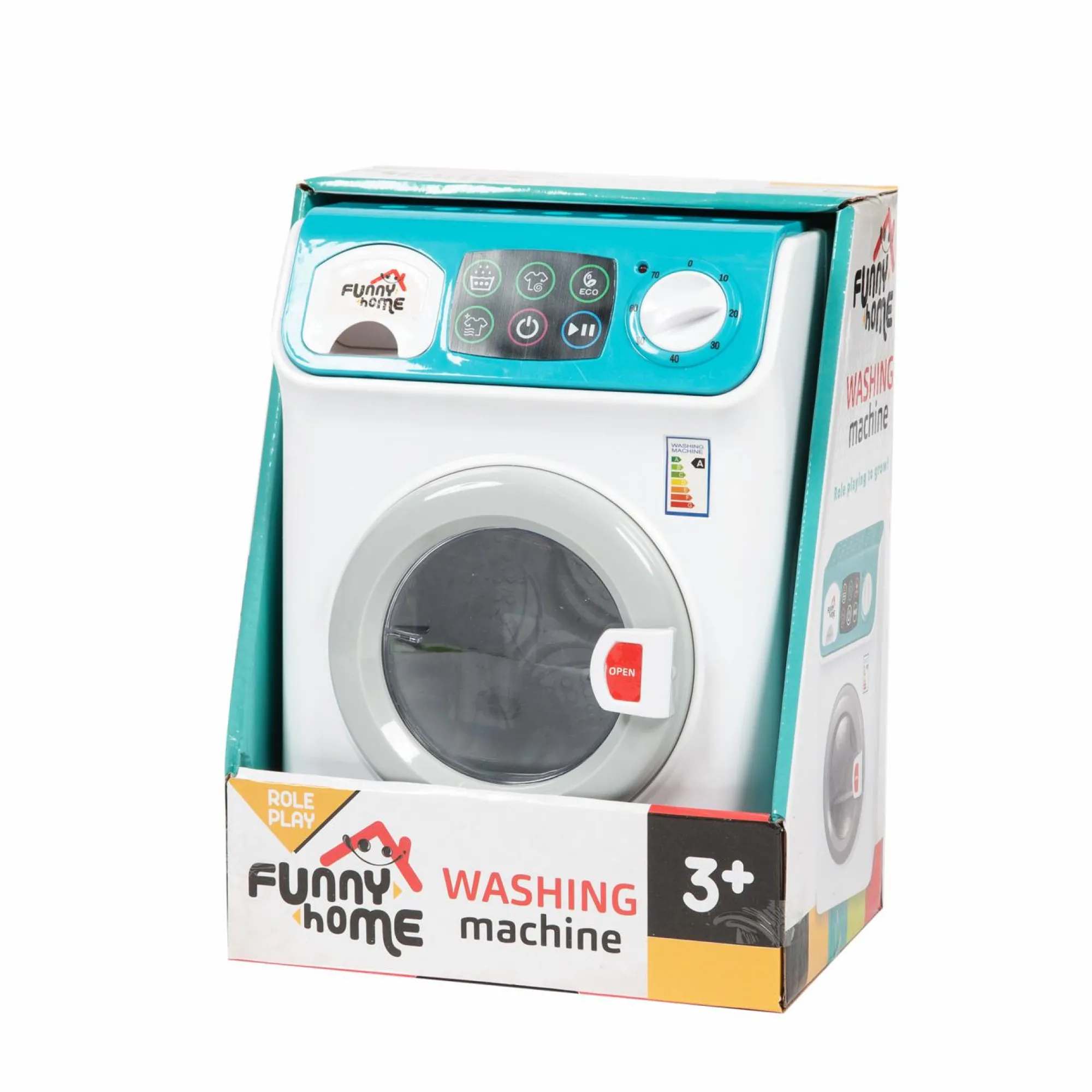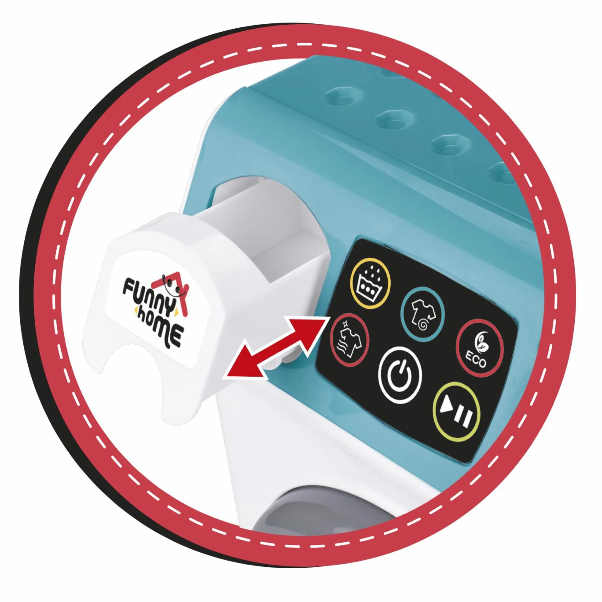 La lavatrice riproduce il funzionamento delle vere lavatrici: tasto con funzione acceso/spento per attivare il lavaggio, cestello dei detersivi apribile, 4 programmi di lavaggio, oblò con effetto acqua apribile, cestello rotante.