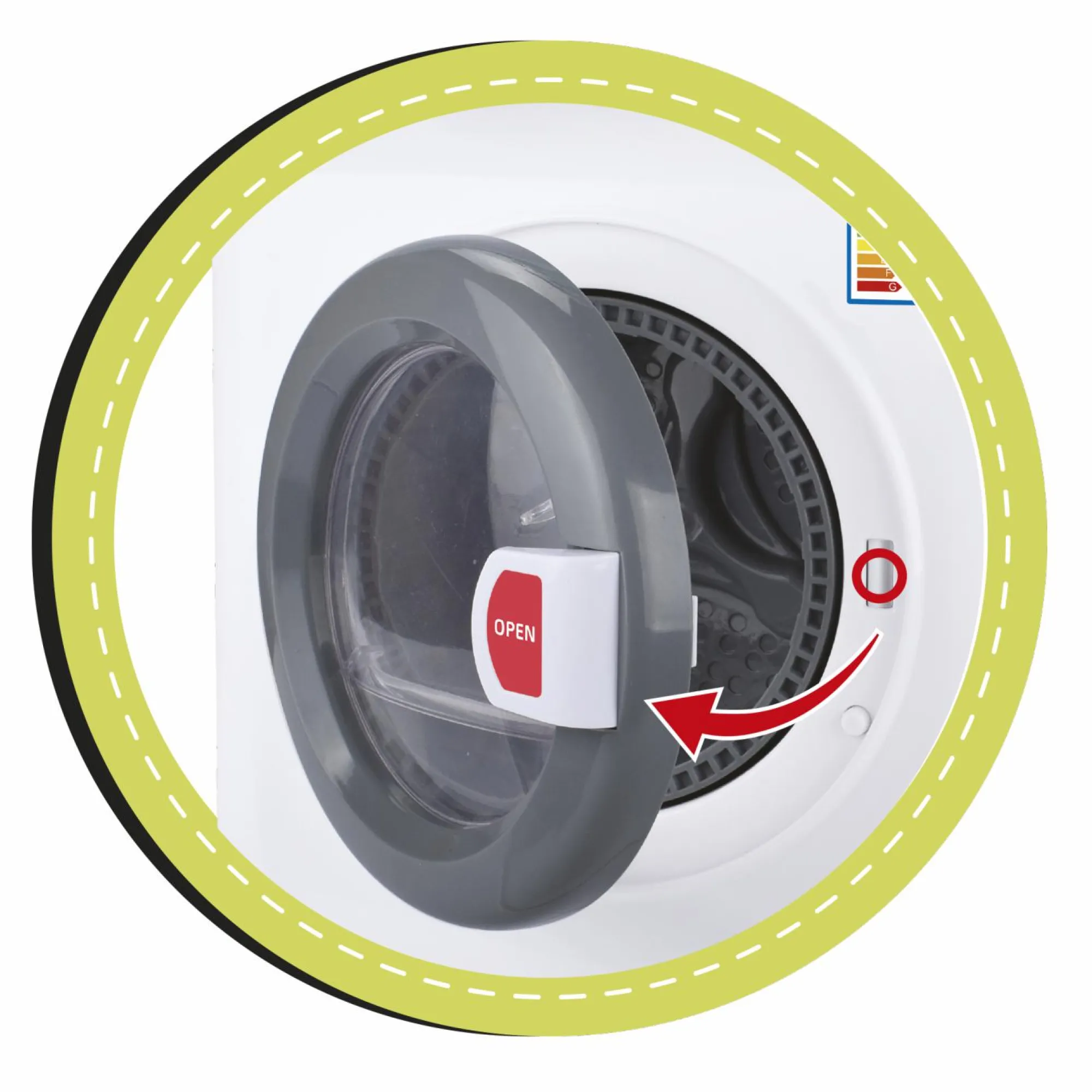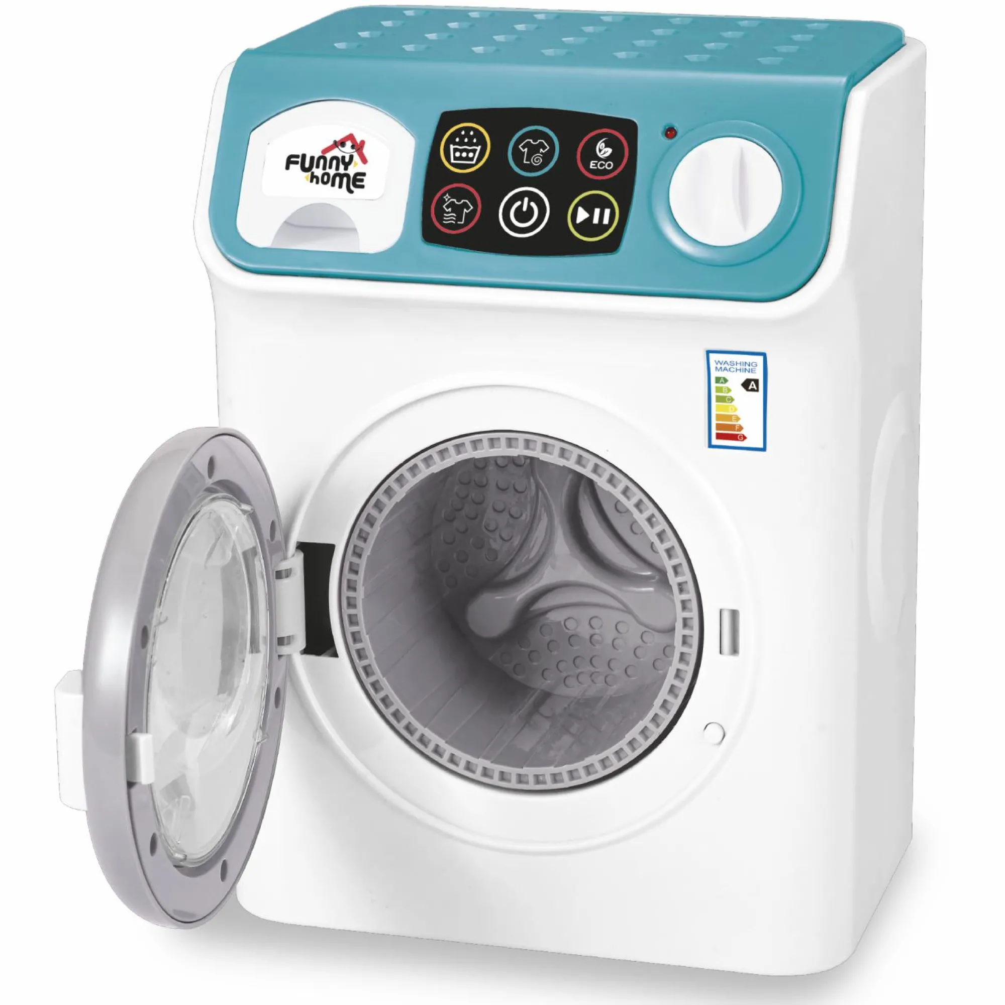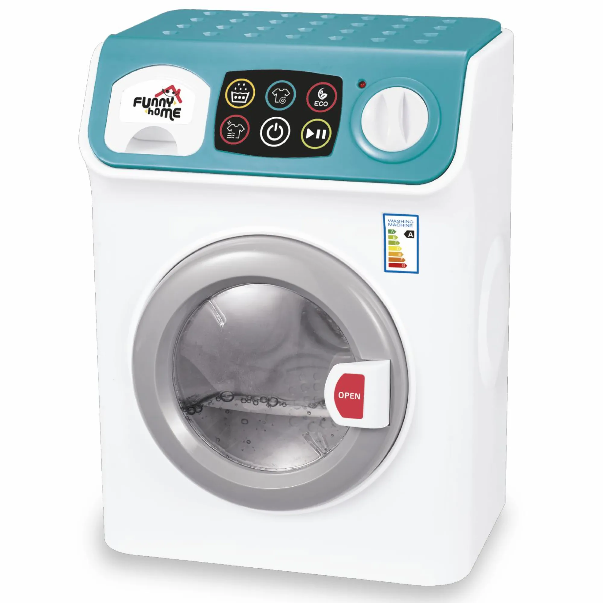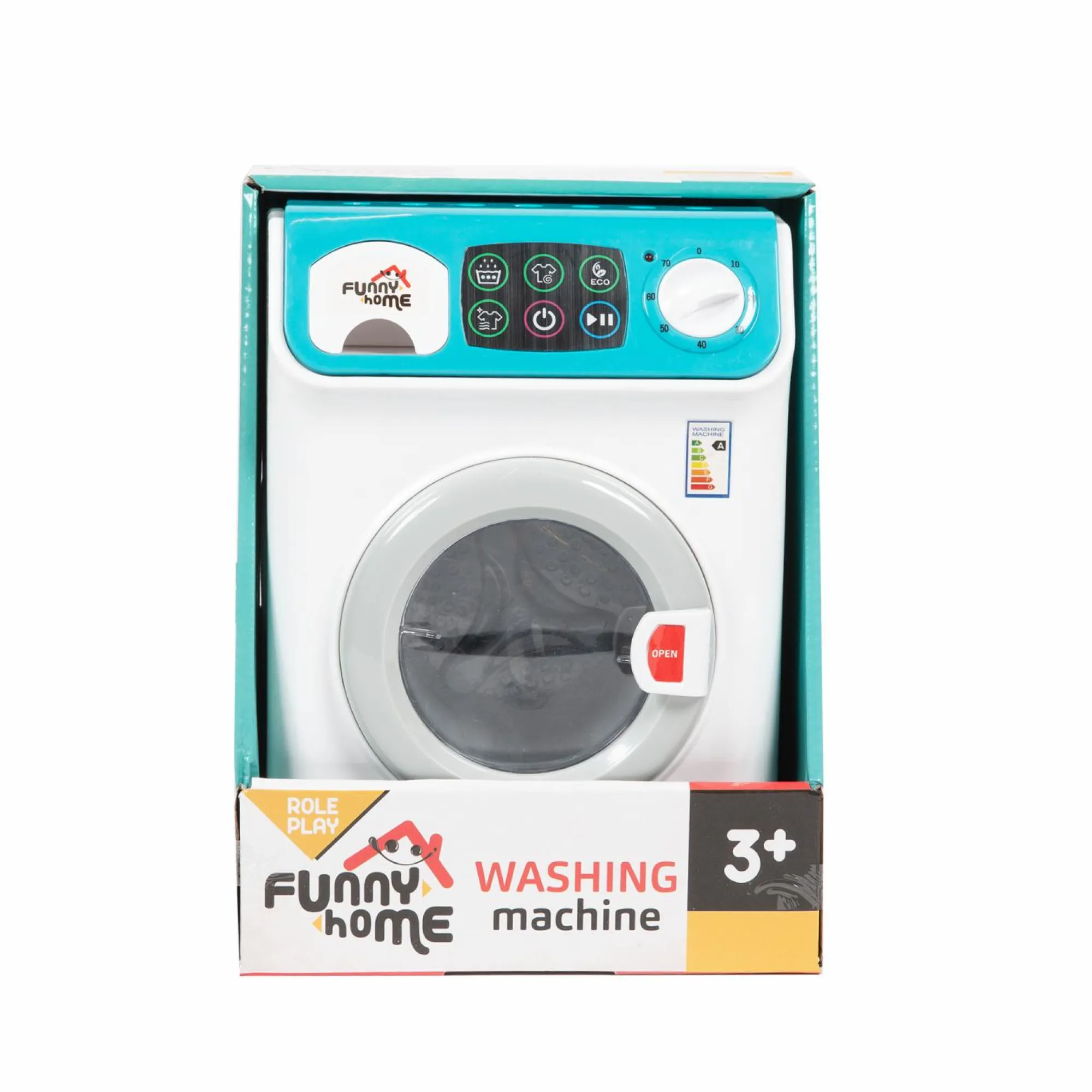 La lavatrice riproduce il funzionamento delle vere lavatrici: tasto con funzione acceso/spento per attivare il lavaggio, cestello dei detersivi apribile, 4 programmi di lavaggio, oblò con effetto acqua apribile, cestello rotante.