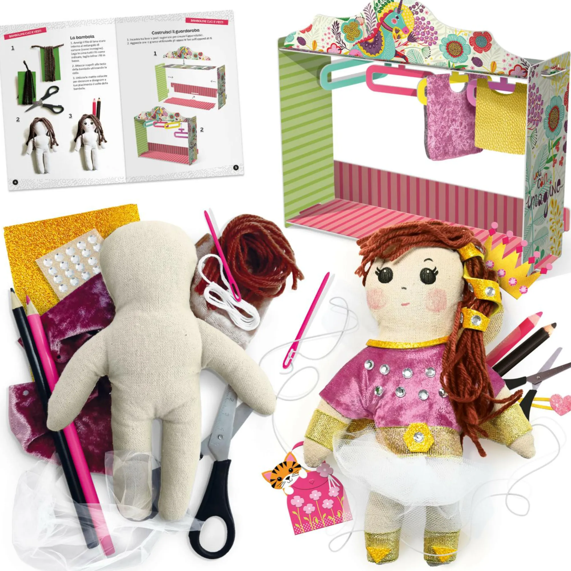 - Contenuto della confezione: 1 bambolina imbottita; 1 appendiabiti in cartone da costruire; Tulle; Sagome di velluto; Nastro; Filo di lana; Filo di cotone; Strass adesivi; Ago di plastica; 2 matite colorate; Foglio-eva glitterato; Forbici; Colla; Sagome di cartone; Disegni da ritagliare; Istruzioni