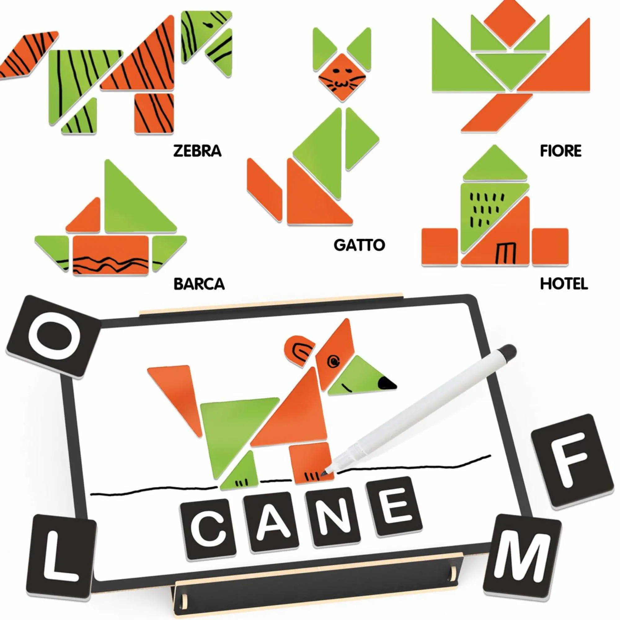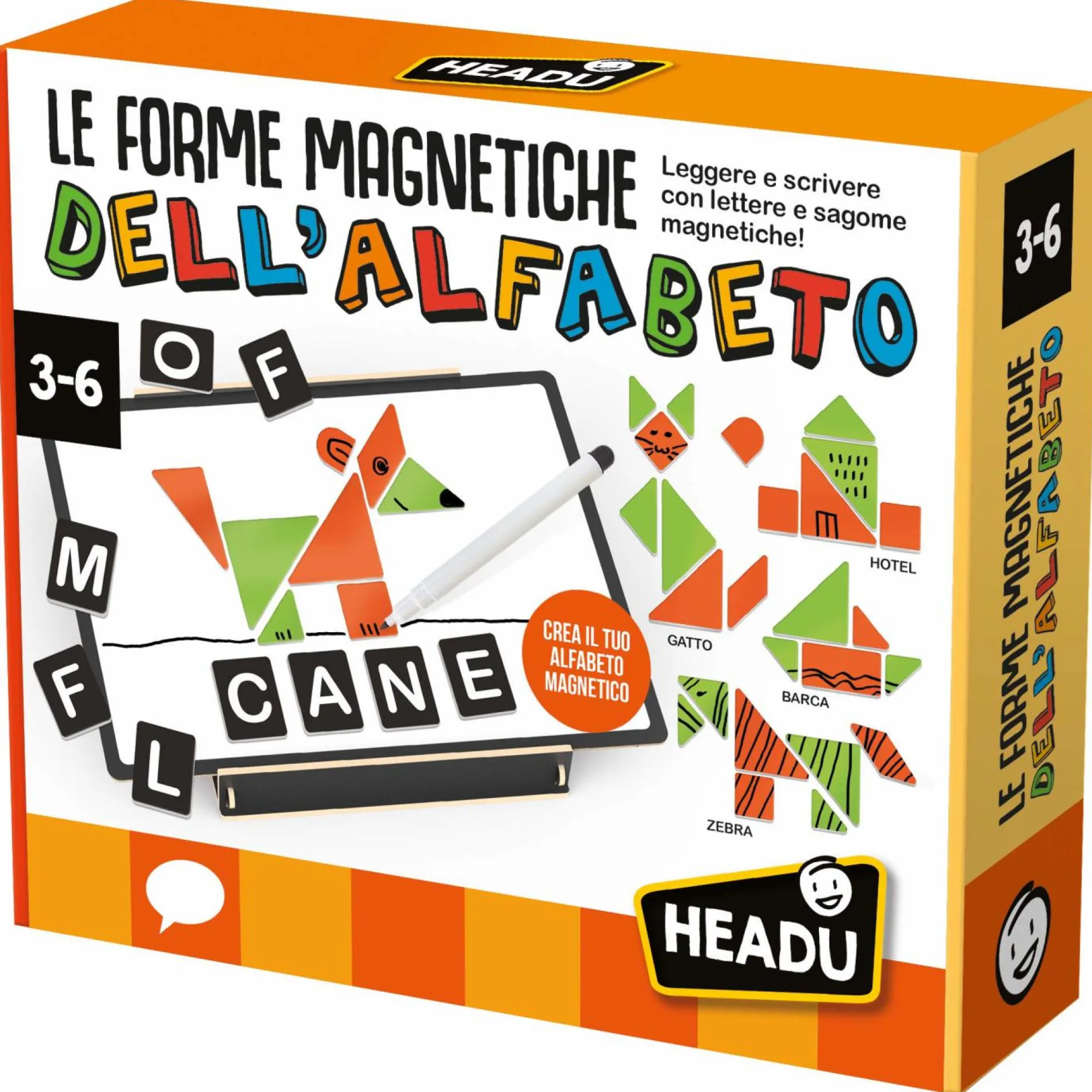 49 Letterine; 26 Sagome; 1 Lavagna magnetica; 70 dischetti magnetici; 1 Pennarello scrivi e cancella; 1 Quaderno operativo; 1 Guida didattica