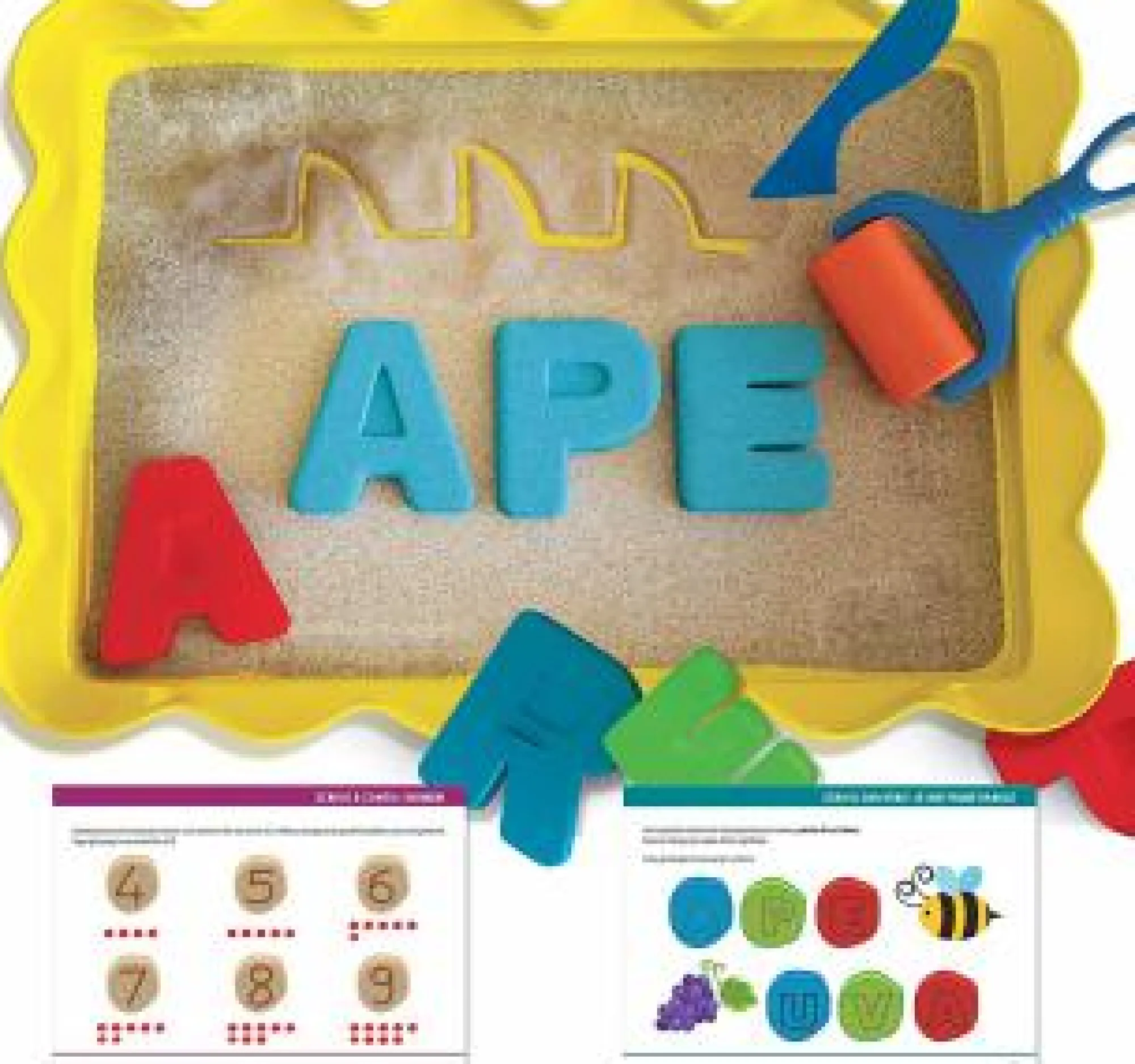1 base di plastica • 700 grammi di sabbia in vari colori • 1 roll • 26 formine ABC • 1 spatolina • 1 manuale didattico