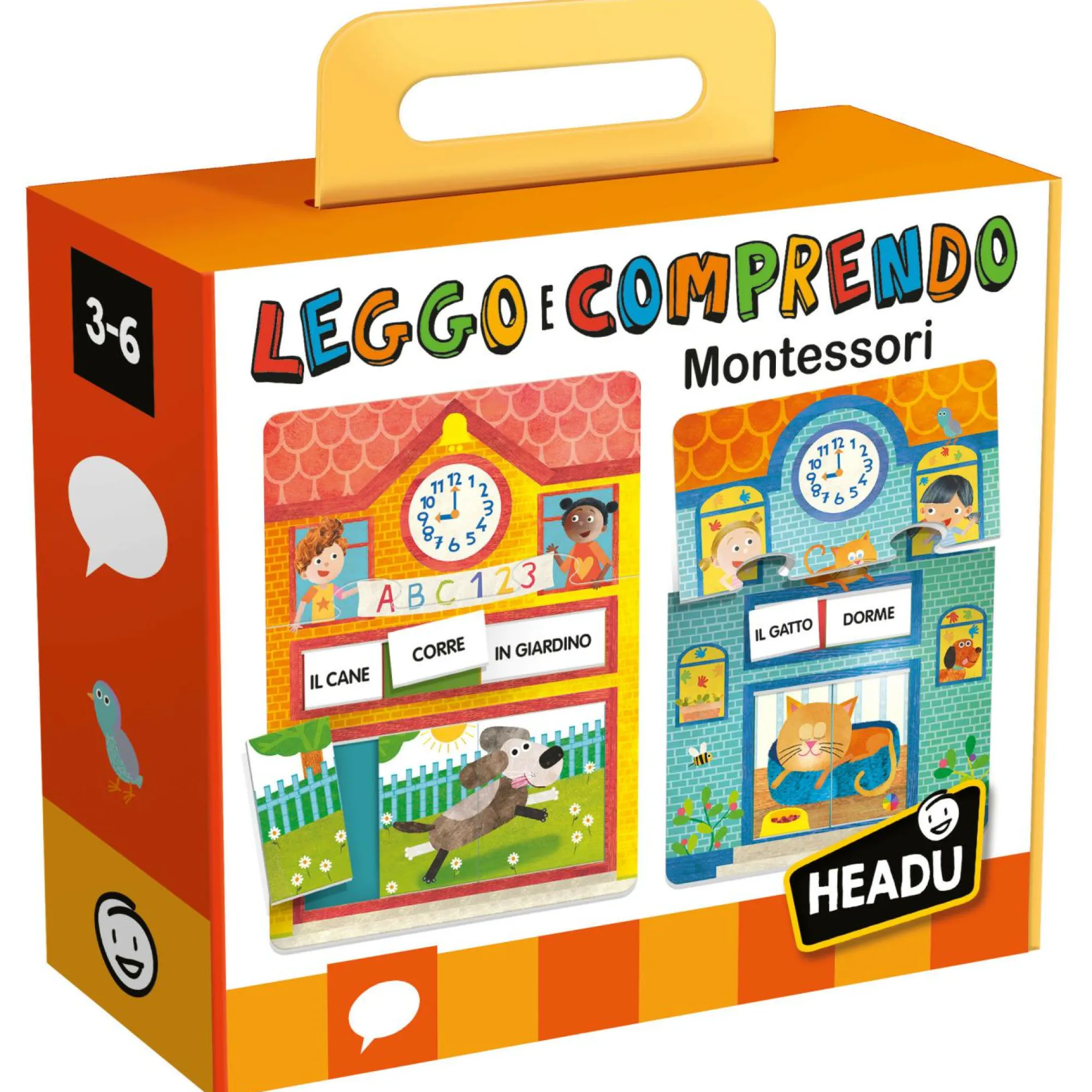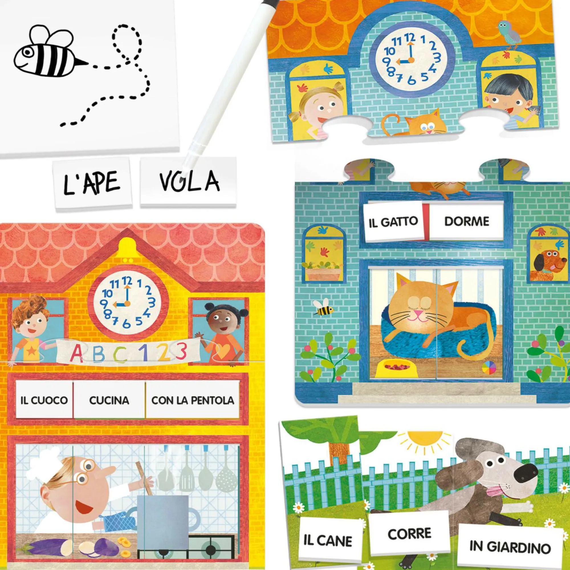 2 basi compositoio; 18 frasi da 36 tasselli; 2 lavagnette scrivi e cancella; 2 supporti frase scrivi e cancella; 1 pennarello; Istruzioni