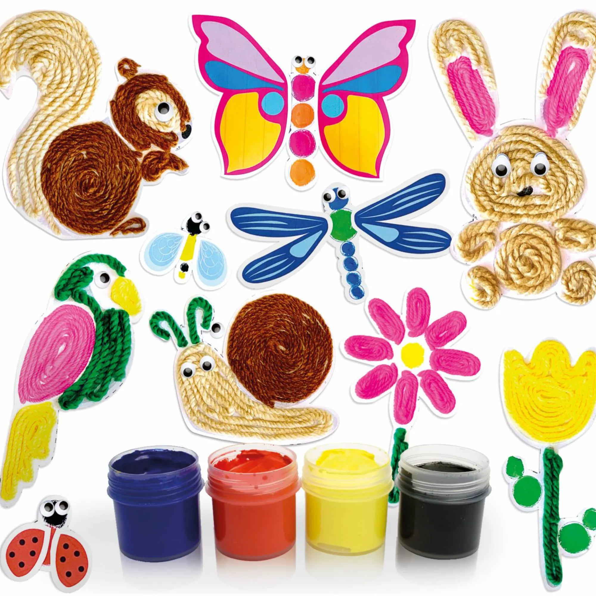 5 barattoli di finger paint; Occhietti adesivi; Colla stick; Cartoncino colorato; Fili di lana; Istruzioni