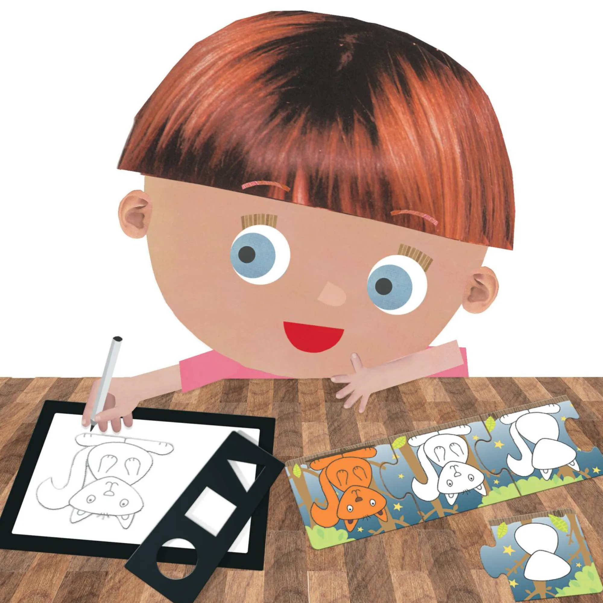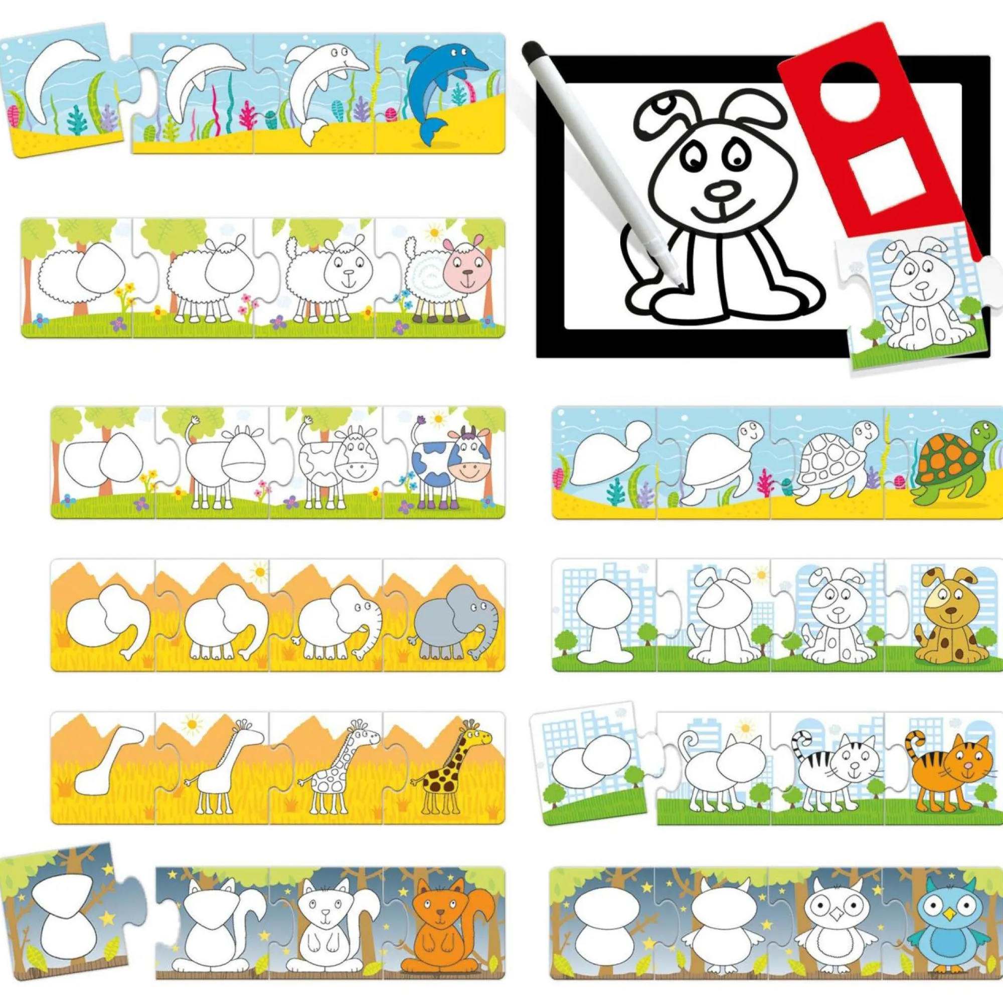 Contenuto: 10 puzzle progressivi degli animali; pennarello disegna e cancella; lavagnetta cancellabile; stencil