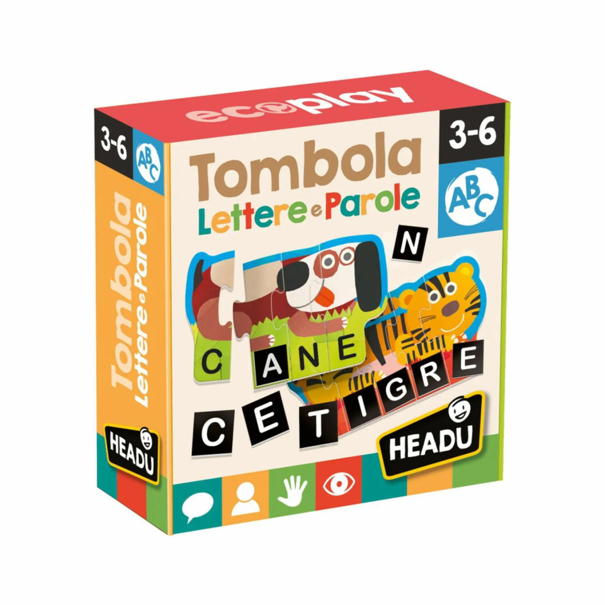9 puzzle parola progressivi (3 da 3 pezzi, 3 da 4 pezzi e 3 da 5 pezzi); 1 scrittorio/Istruzioni; 44 letterine