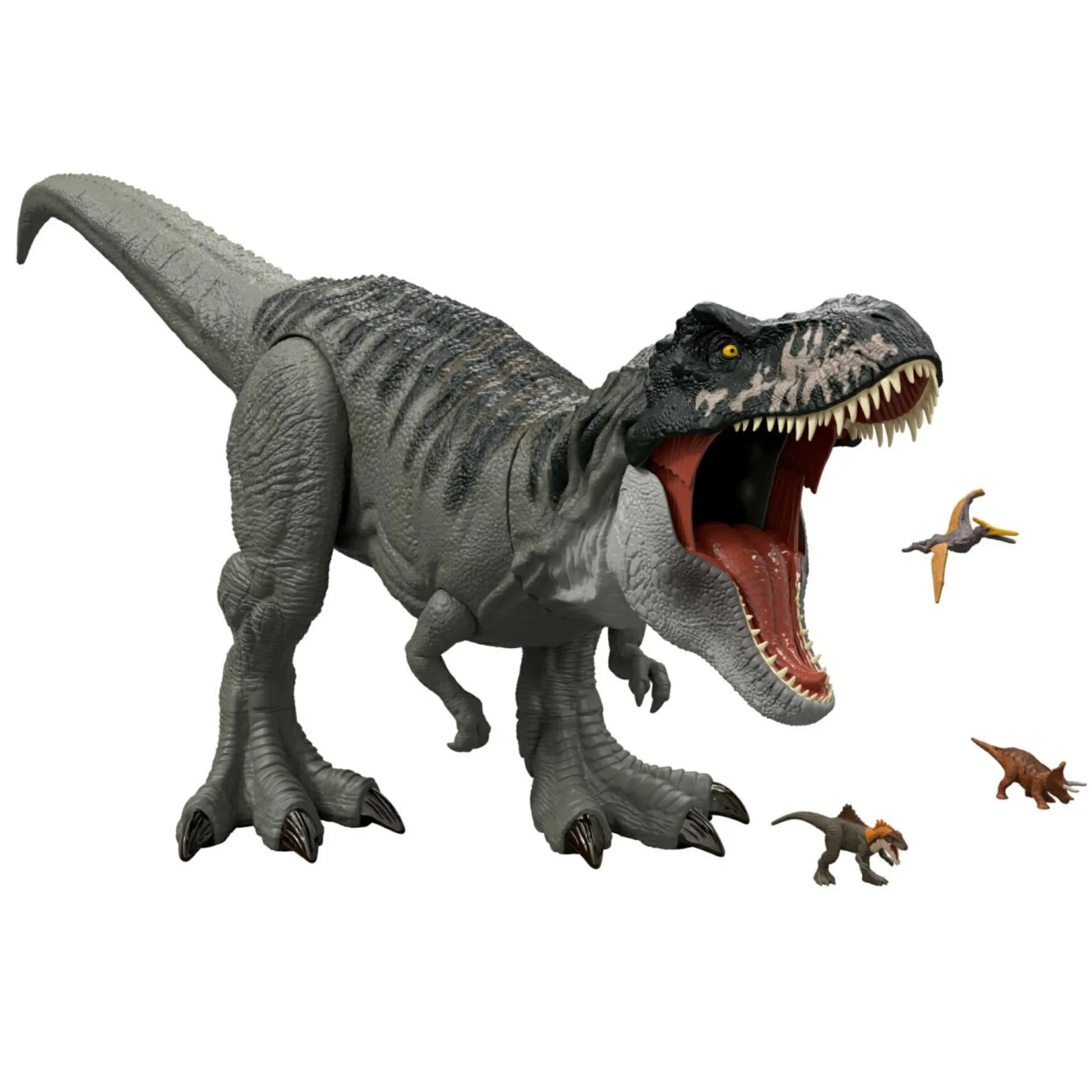 Divertimento all’ultimo morso! Le articolazioni mobili sono pronte per le mosse da combattimento, tra cui la mandibola che si apre a 35 gradi, pronta a “inghiottire” i mini dinosauri. (Mini dinosauri in vendita separatamente).