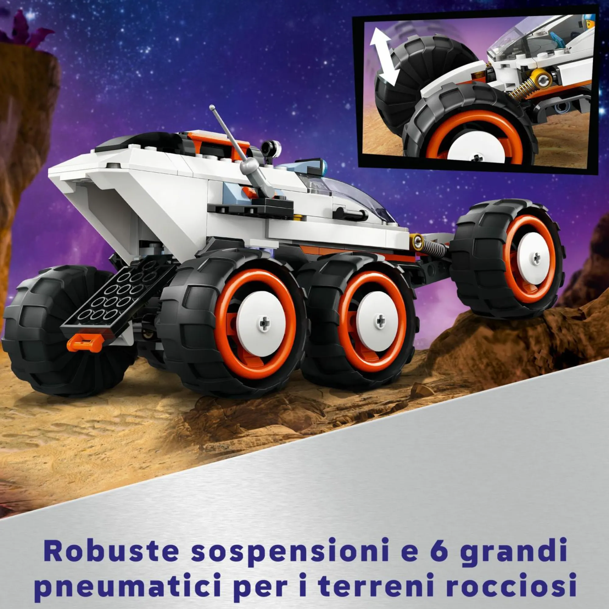 Veicolo giocattolo futuristico: il modellino di rover LEGO è dotato di cabina di guida per 2 persone, di 6 ruote con pneumatici di grandi dimensioni, e di sospensioni per spostarsi sui pianeti alieni