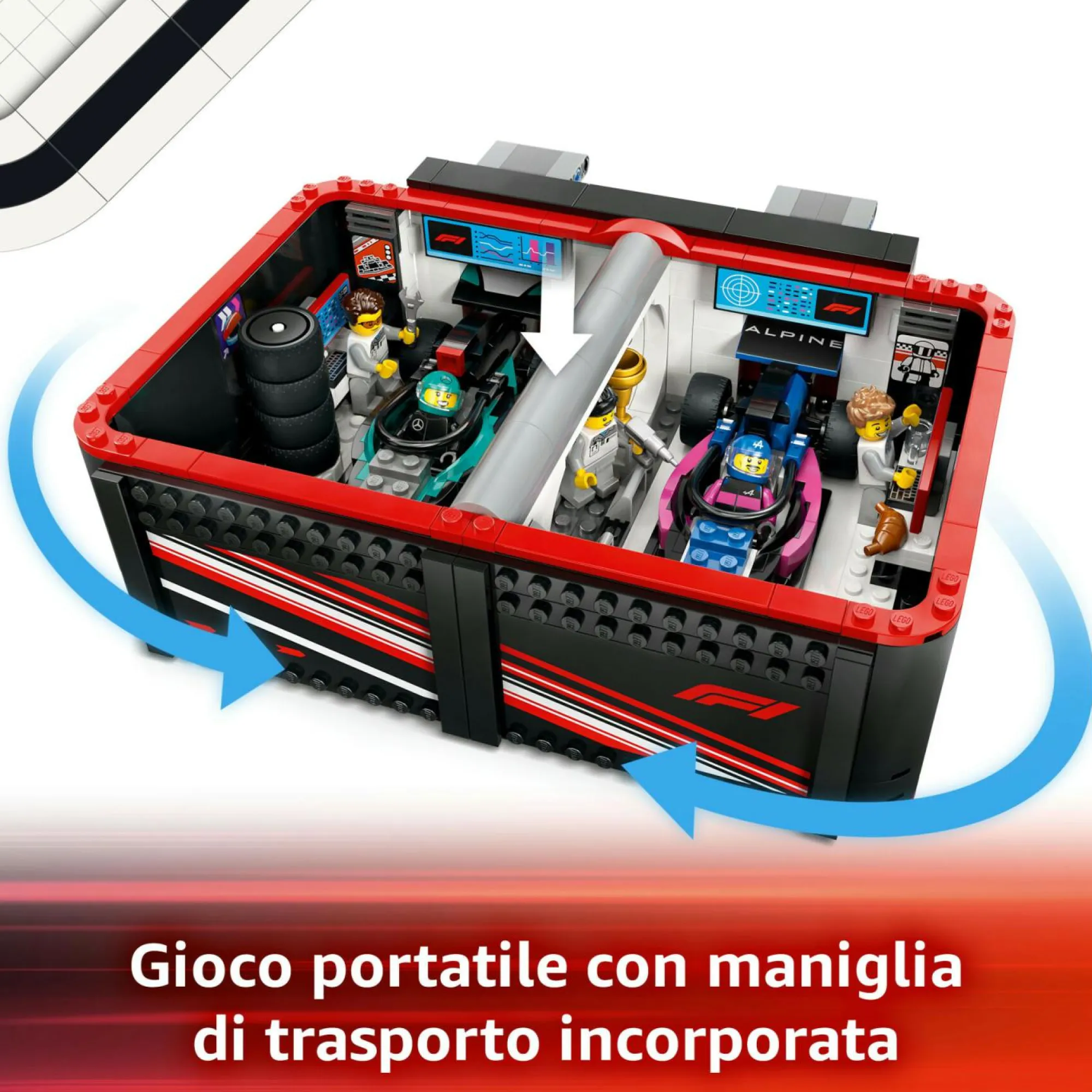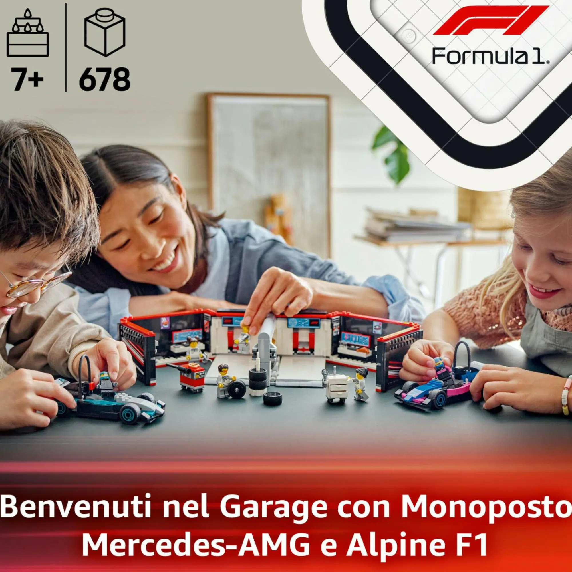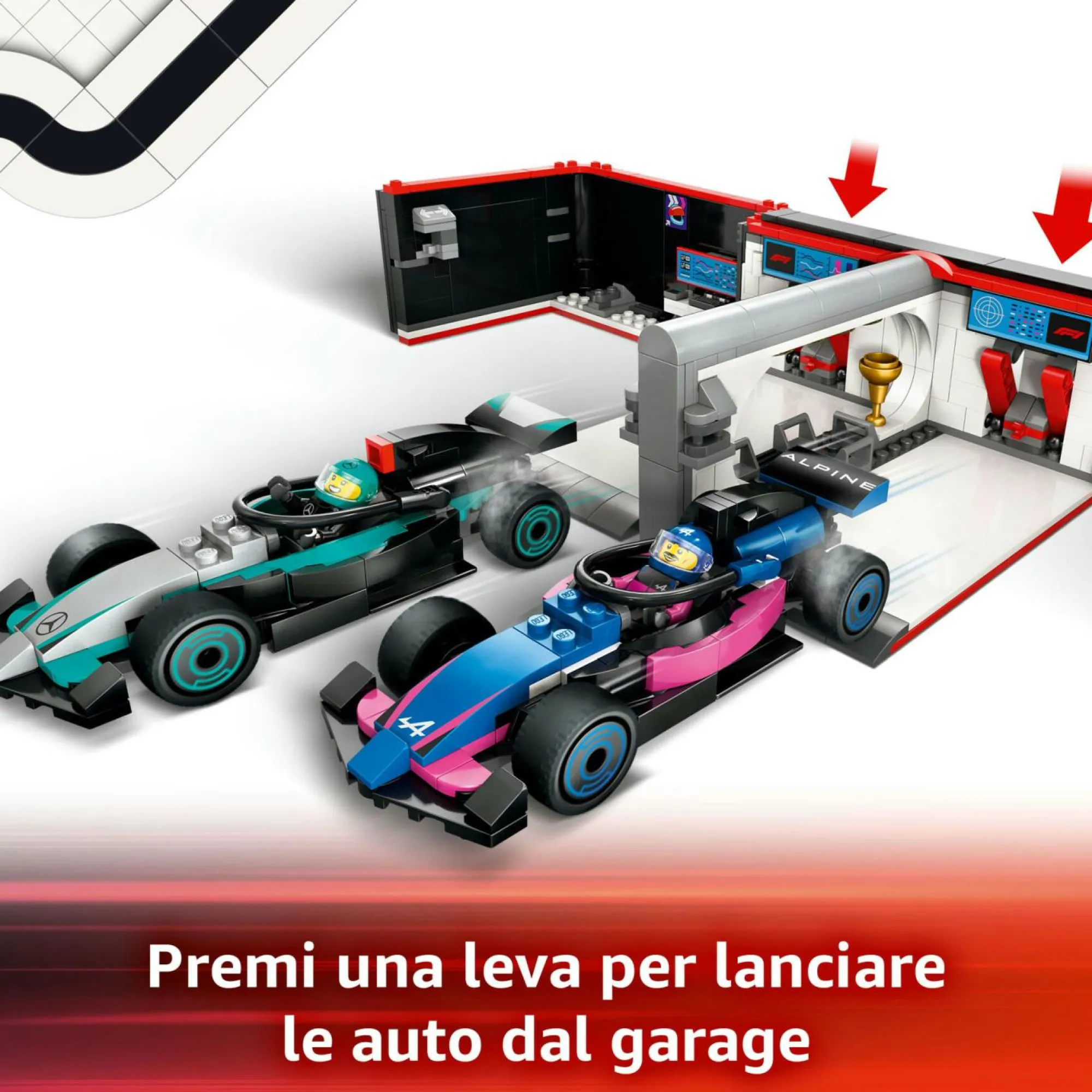 Garage con auto LEGO da costruire: questo gioco per bambini e bambine da 7 anni in su, il Garage con Monoposto Mercedes-AMG e Alpine F1 LEGO City, offre tutto il brivido delle corse grazie a 2 macchine giocattolo da Formula 1 e un box attrezzato