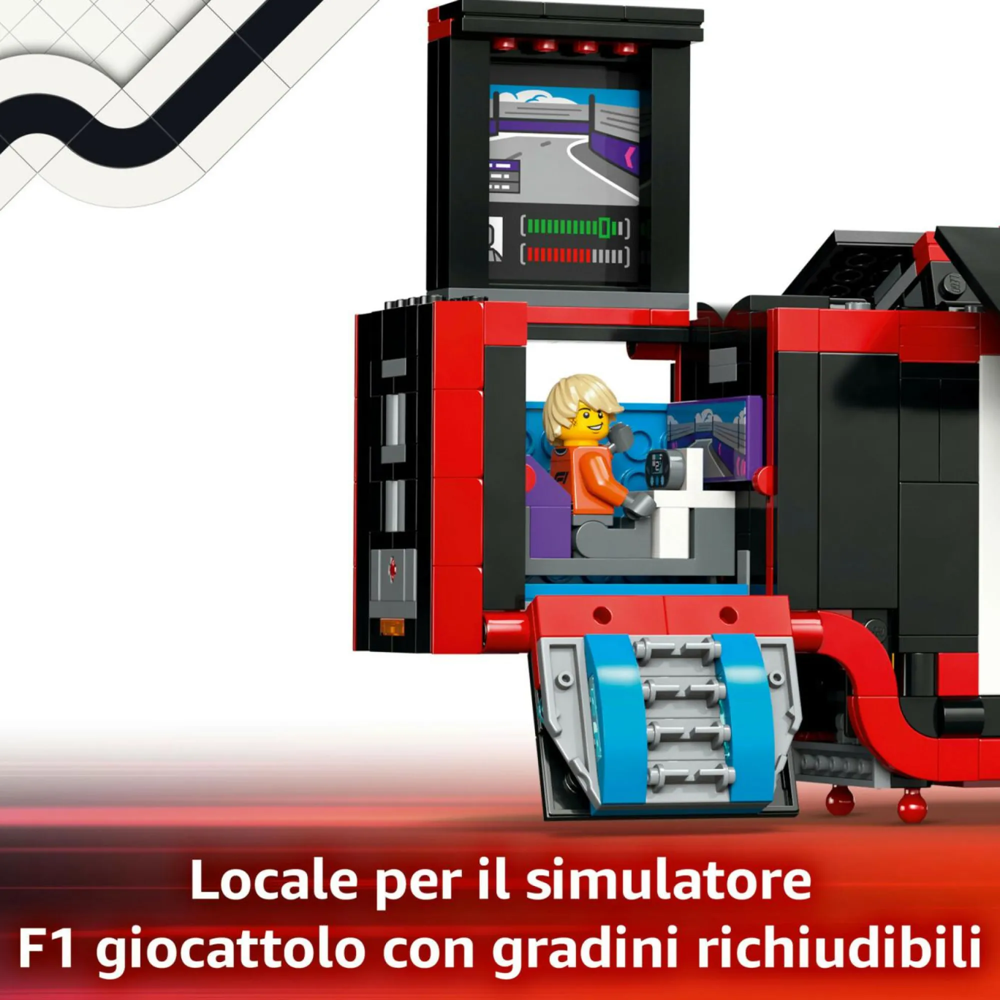 Come nel mondo reale: il rimorchio è dotato di un simulatore di Formula 1 e di doppio vano per veicoli con pannelli laterali apribili, un portello posteriore e rampe per caricare i modelli di auto Red Bull LEGO e l’Aston Martin giocattolo
