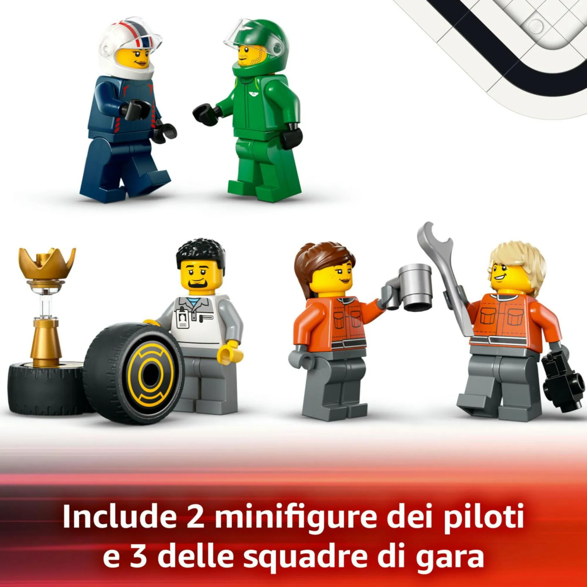 Cosa troviamo nella confezione? I piccoli possono costruire un camion LEGO con un rimorchio ribassato, 2 veicoli giocattolo monoposto e le minifigure di 2 piloti e 3 membri dell’equipaggio, oltre al trofeo del vincitore