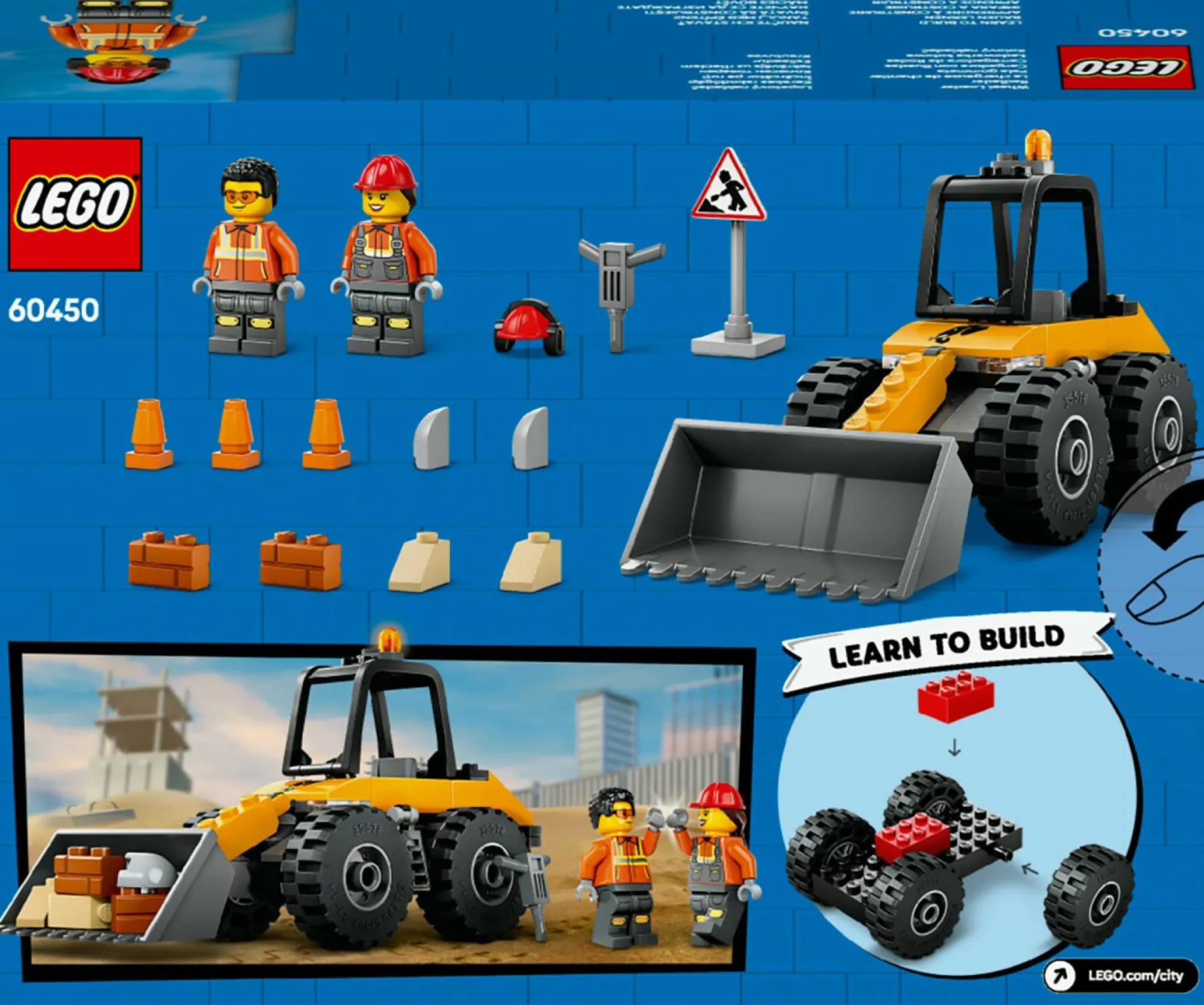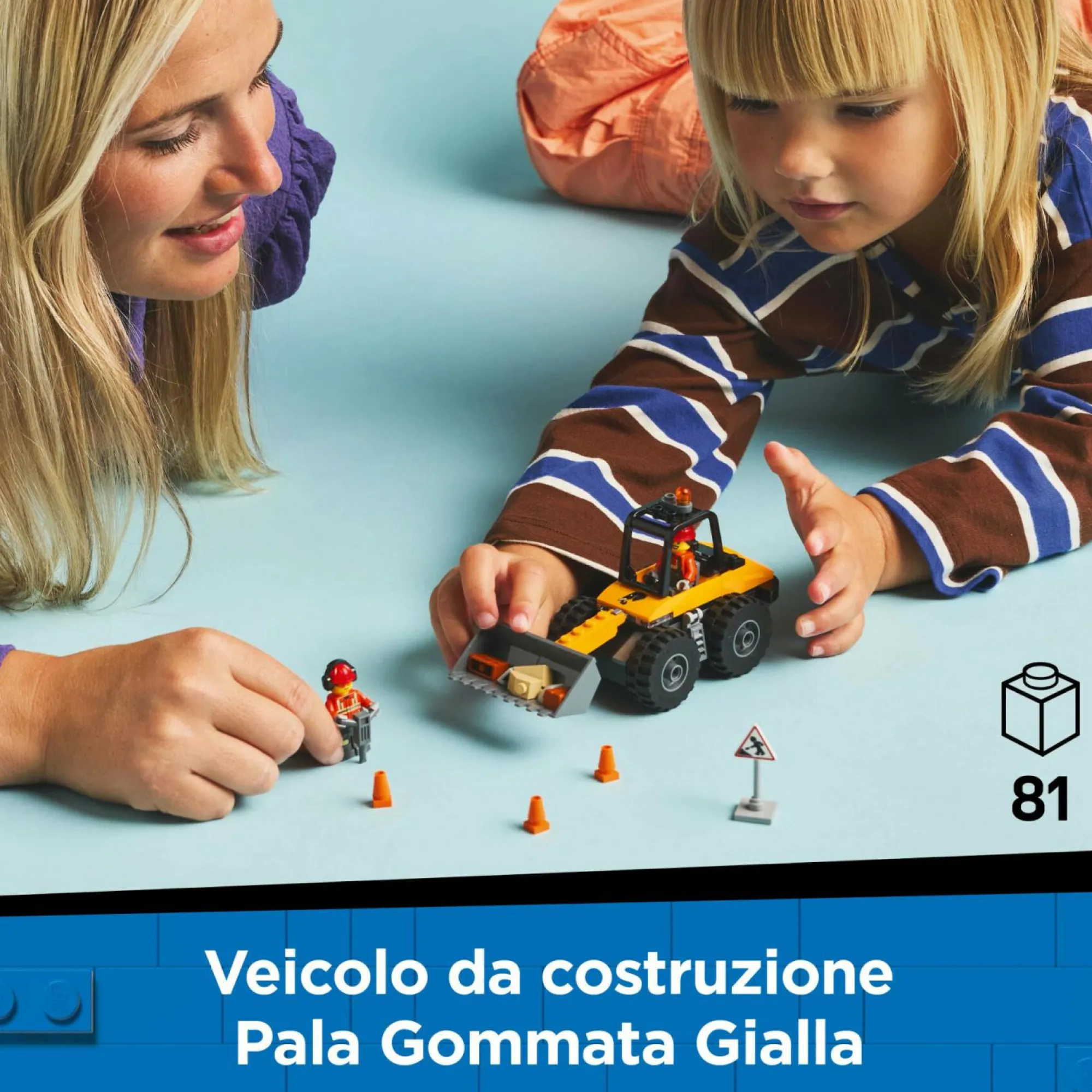 Cosa offre la scatola? Il set comprende uno scavatore giocattolo costruibile con pala, le minifigure dell’operatore e dell’operaio, un cartello stradale, coni stradali e un martello pneumatico giocattolo
