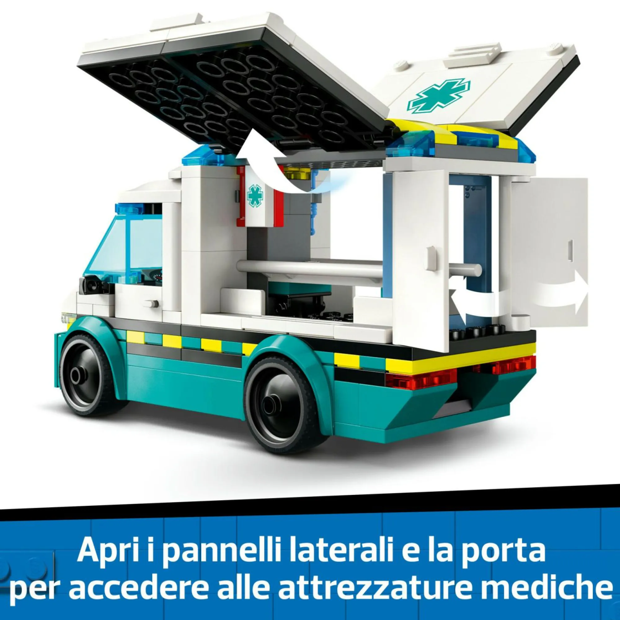 Ambulanza giocattolo per giovani medici in erba: questo set di giochi con le costruzioni per bambini e bambine da 5 anni in su, l’Ambulanza di Emergenza, offre tante funzioni realistiche per emozionanti avventure di soccorso LEGO City