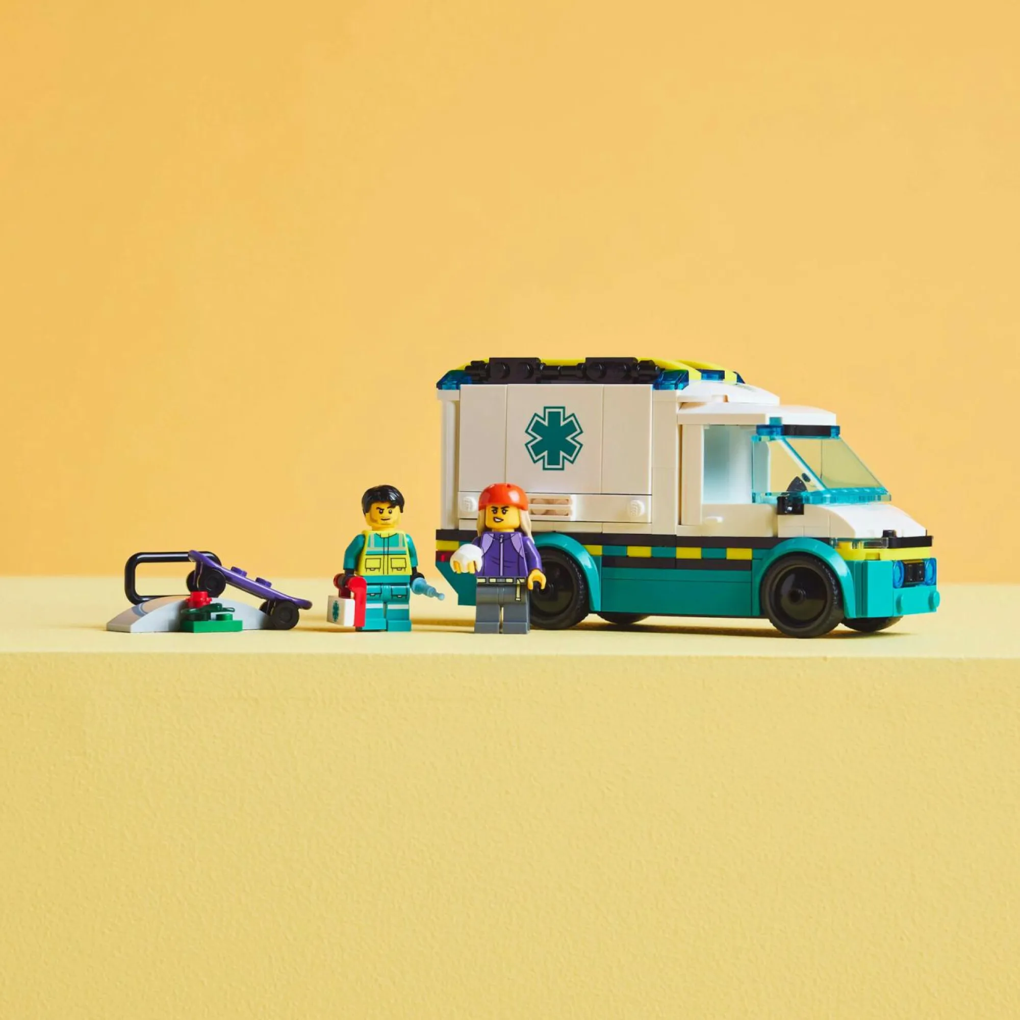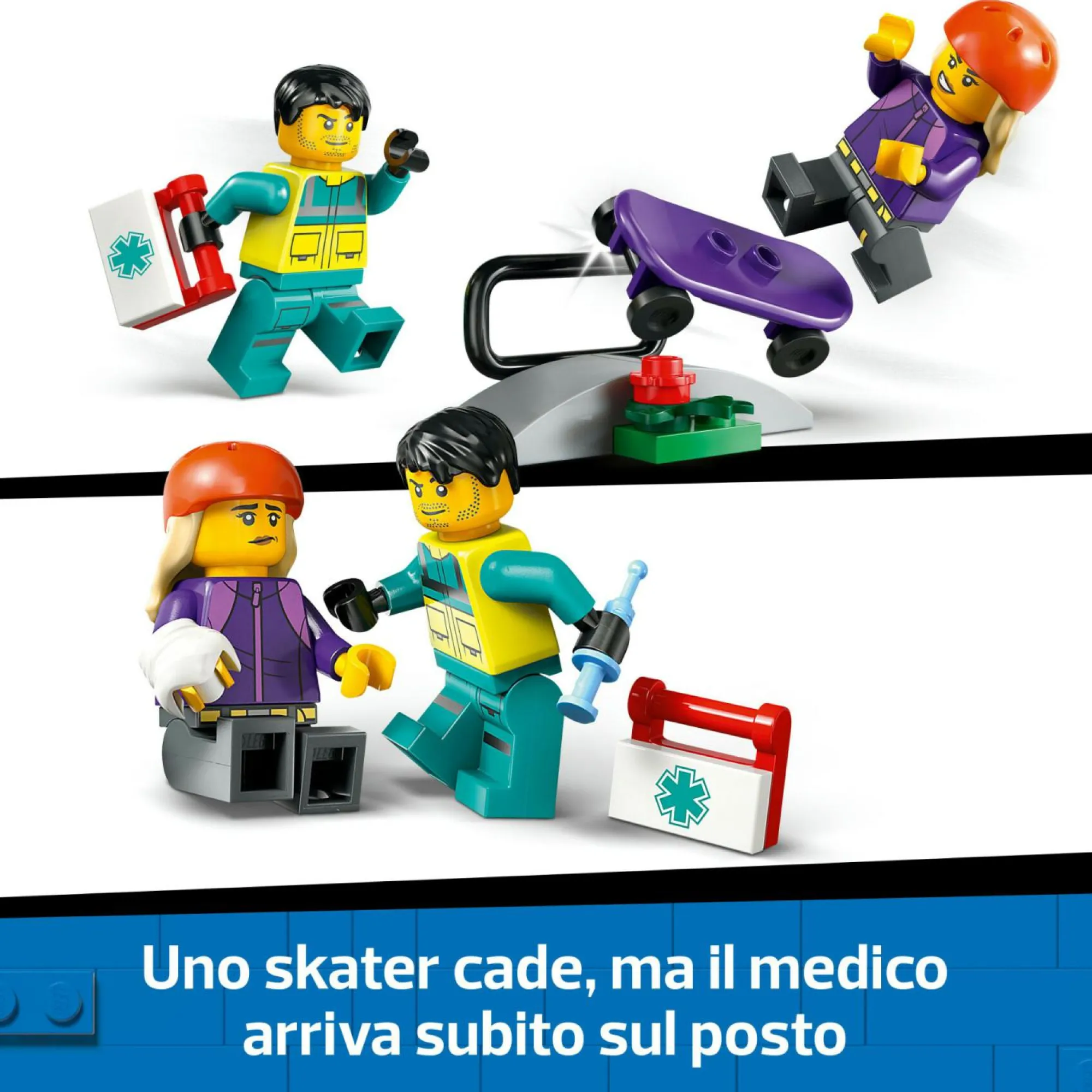 Cosa offre la confezione? Tutto il necessario per costruire un’ambulanza LEGO in mattoncini, oltre a una rampa per skateboard e le minifigure dello skateboarder e del paramedico per il gioco di ruolo