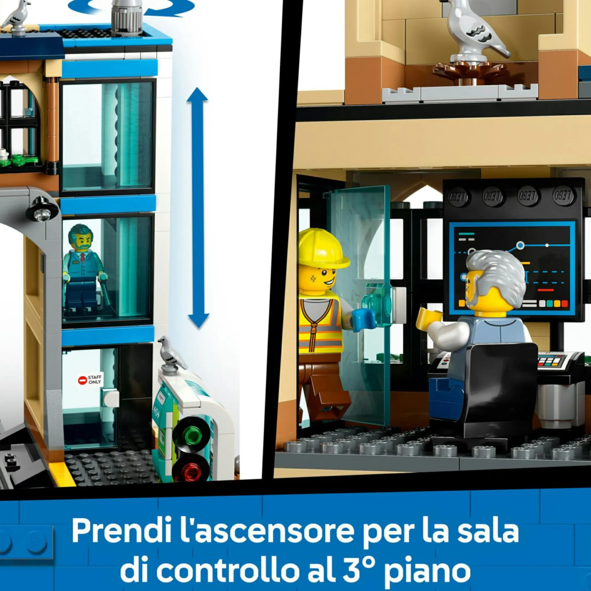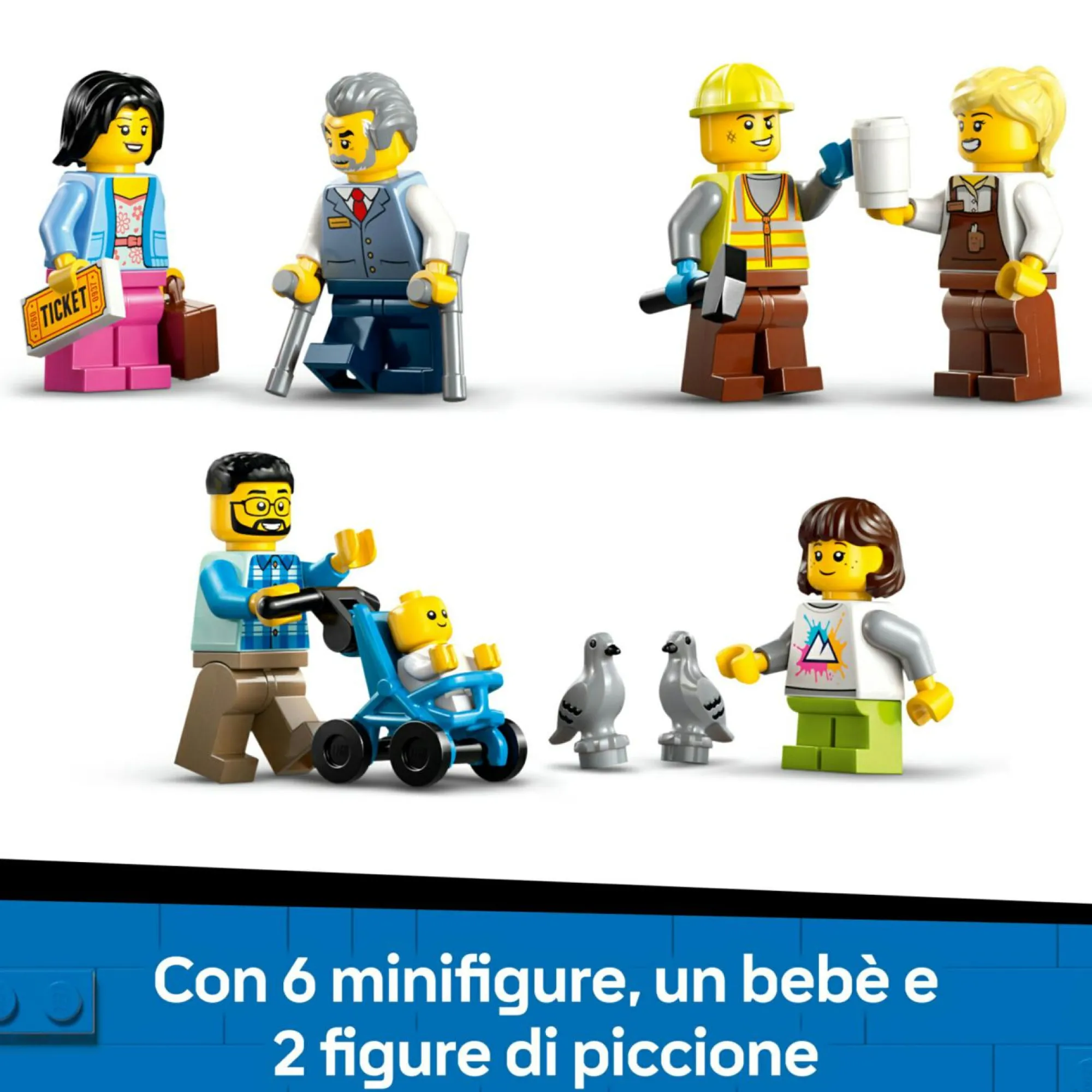 Cosa comprende la stazione LEGO City: per tante ore di giochi di ruolo, il set include una stazione a 3 livelli, un’automotrice per la manutenzione dotata di gru giocattolo a cestello, 6 minifigure, un bebè, 2 piccioni e degli elementi binari LEGO