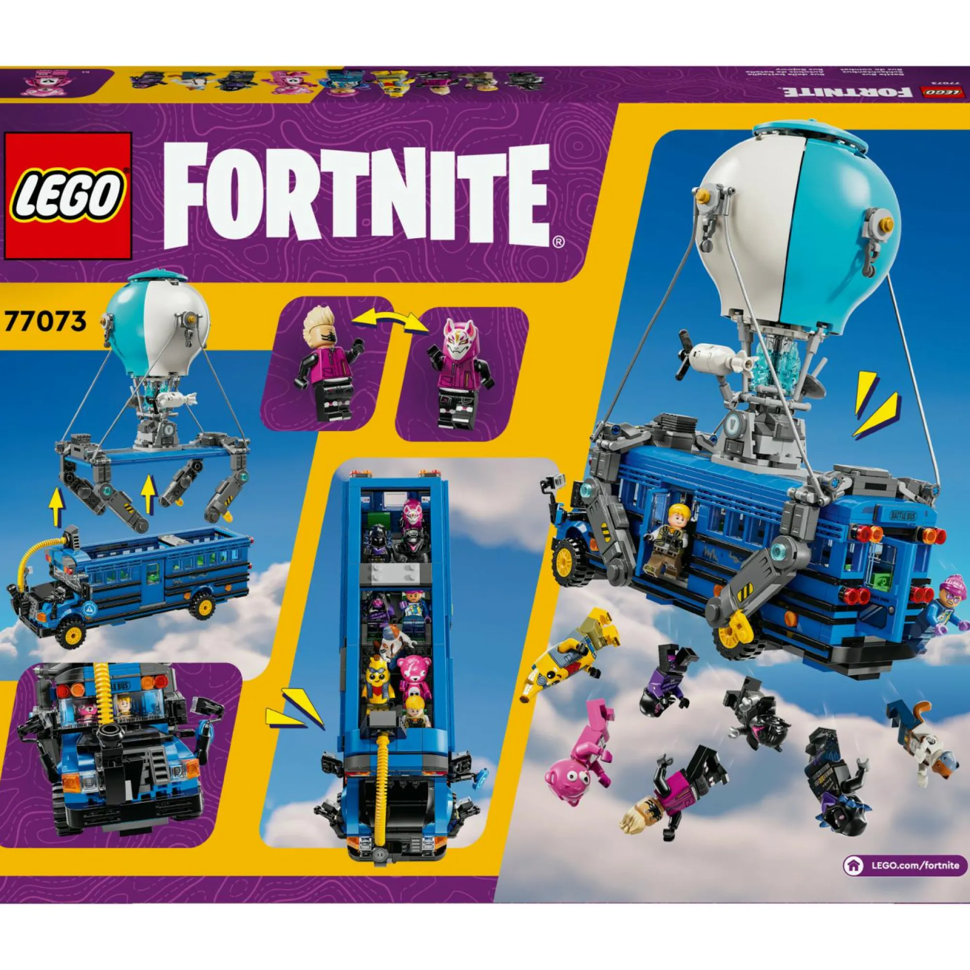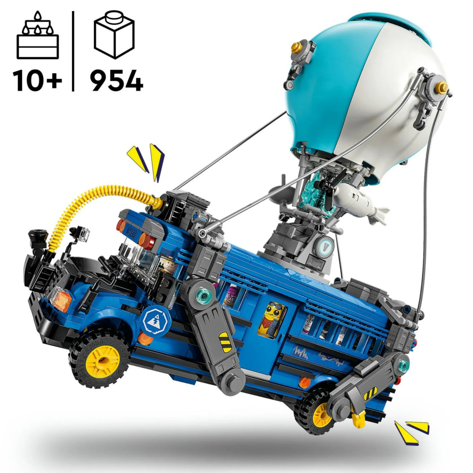 Ricco di dettagli: l’autobus giocattolo LEGO Fortnite, dotato di ruote funzionanti, tetto rimovibile e mongolfiera, comprende tanti accessori, tra cui il succo succoso, un rampino, picconi e una schiaffobomba