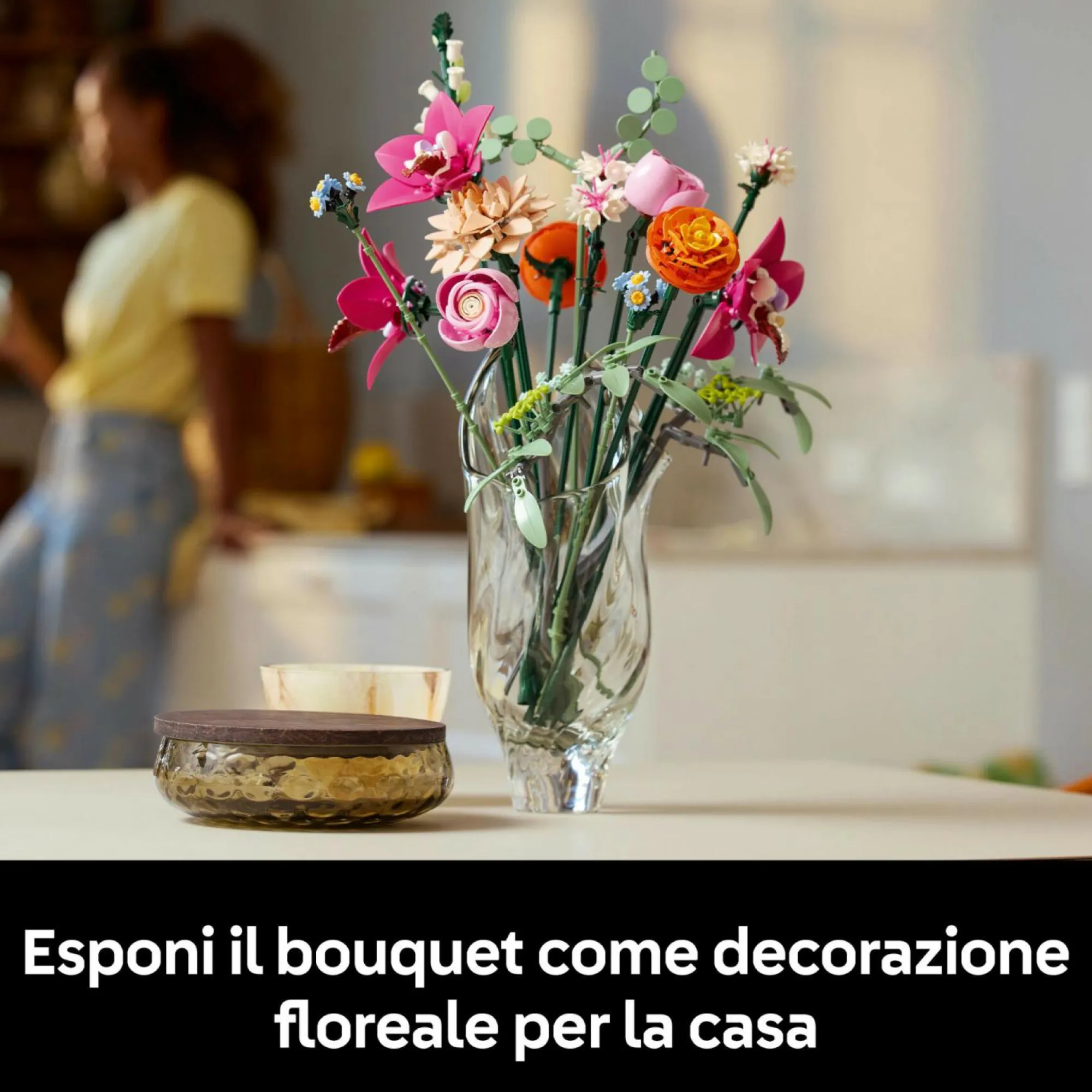 Fiori LEGO: il set contiene 15 steli di fiori artificiali da costruire, tra cui margherite, fiordalisi, eucalipto, fiori di sambuco, rose, ranuncoli, orchidee cymbidium, una campanula e una dalia waterlily