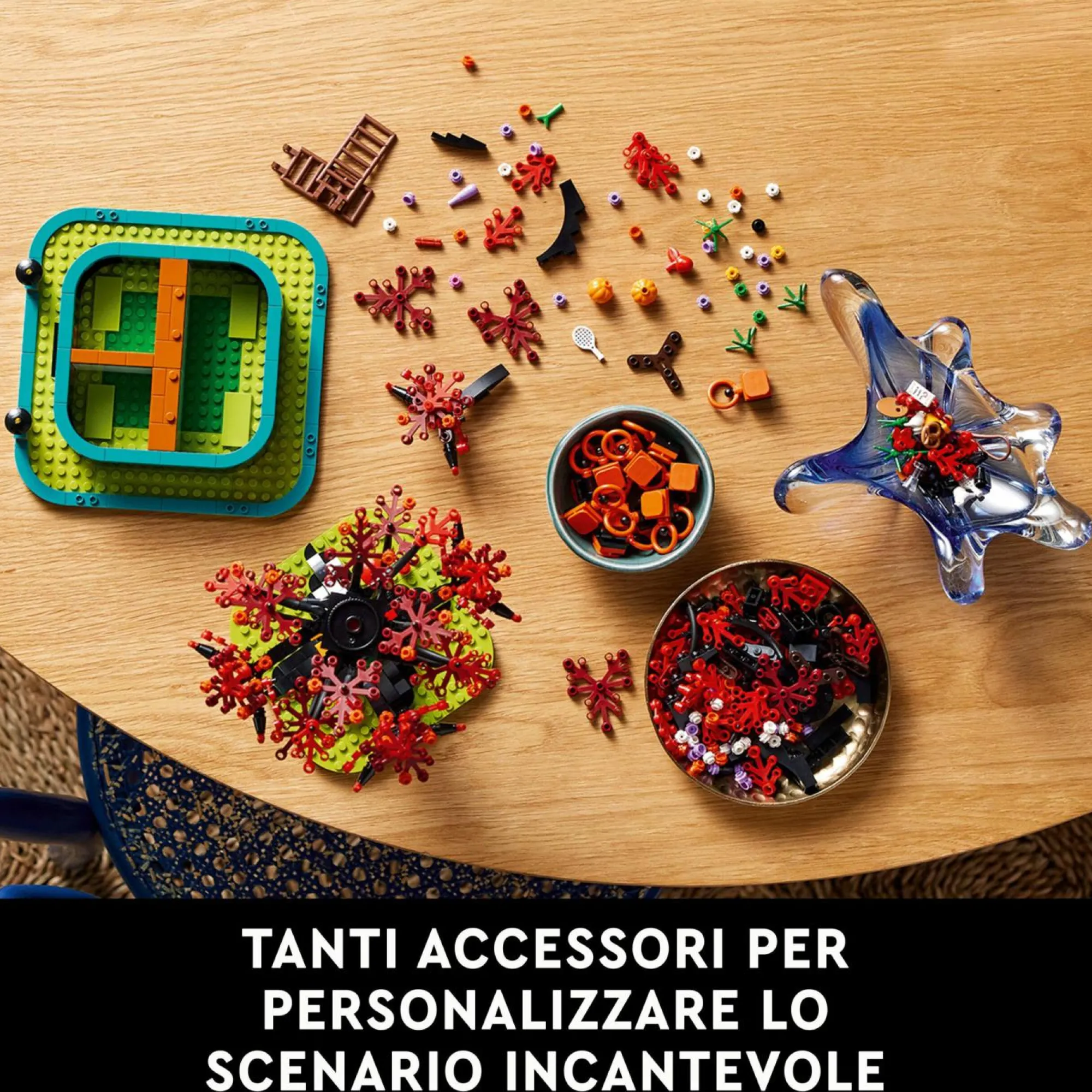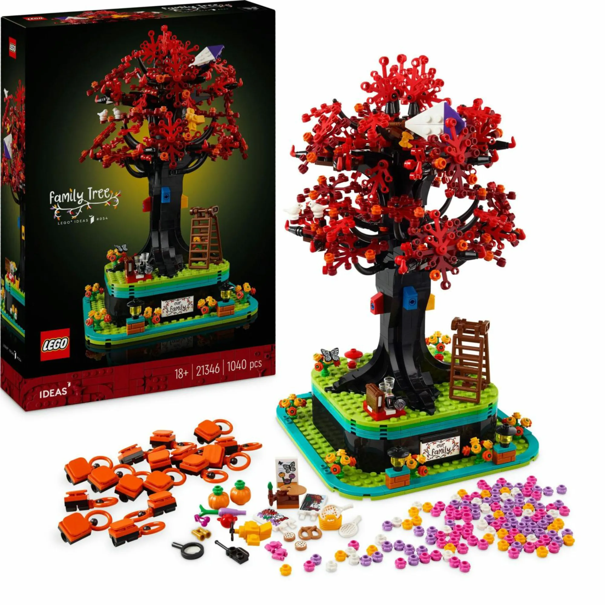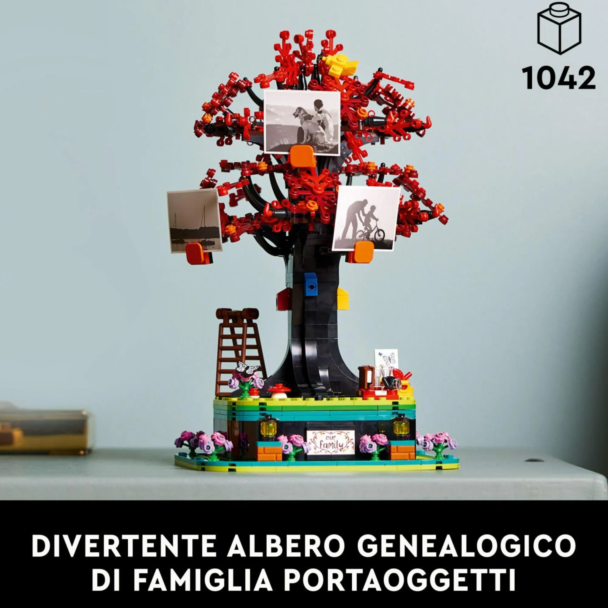 Decora il supporto dell’albero genealogico: il set include accessori da usare come decorazione dell’albero, oltre a una targhetta con la dicitura “Our family” e c’è anche uno spazio nascosto sotto l’albero per gli elementi LEGO