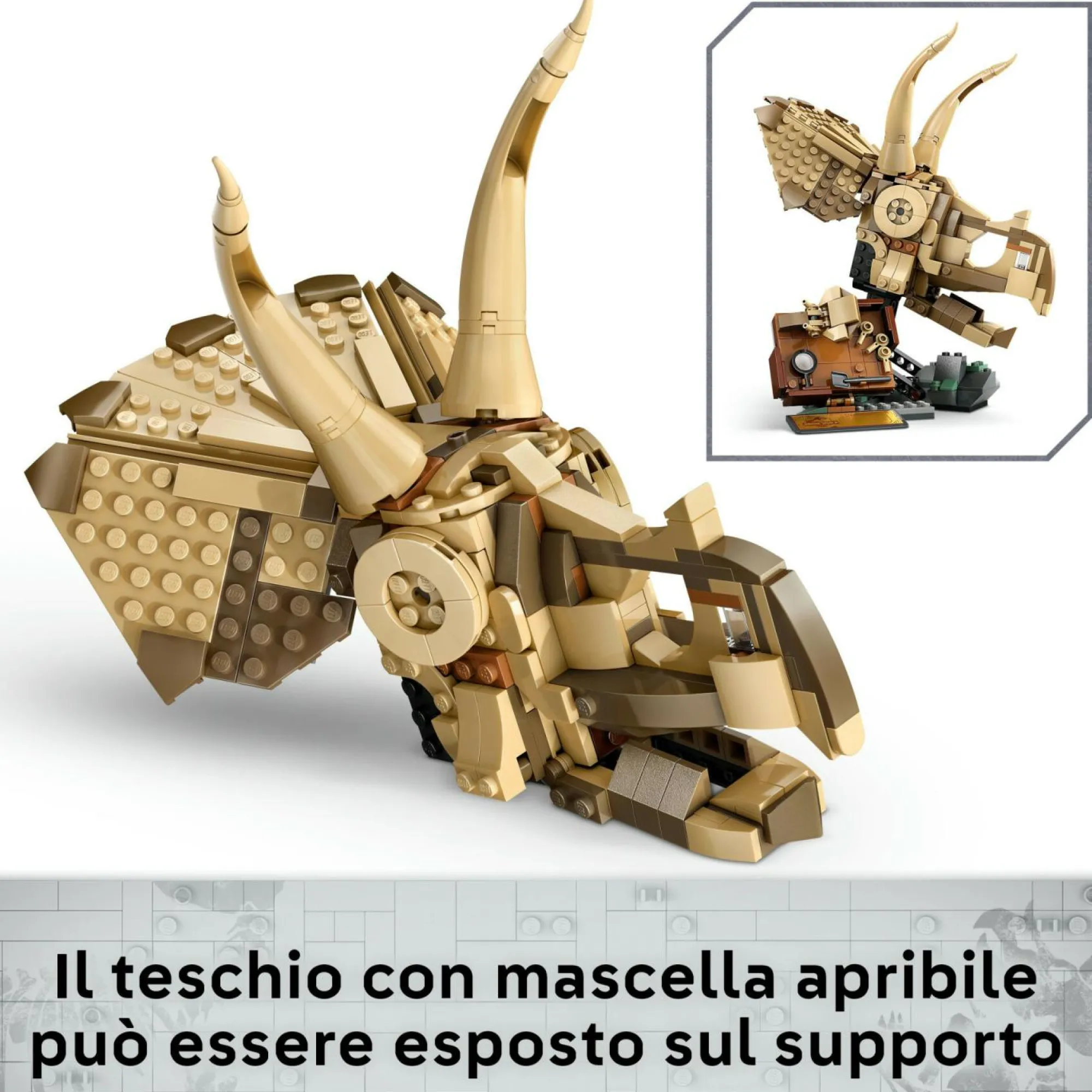Teschio di triceratopo snodabile con mascella apribile: questo teschio giocattolo può essere posizionato aperto o chiuso, sul supporto o accanto alla minifigure, alla targa dello scavo, ai mini-fossili e agli attrezzi di scavo
