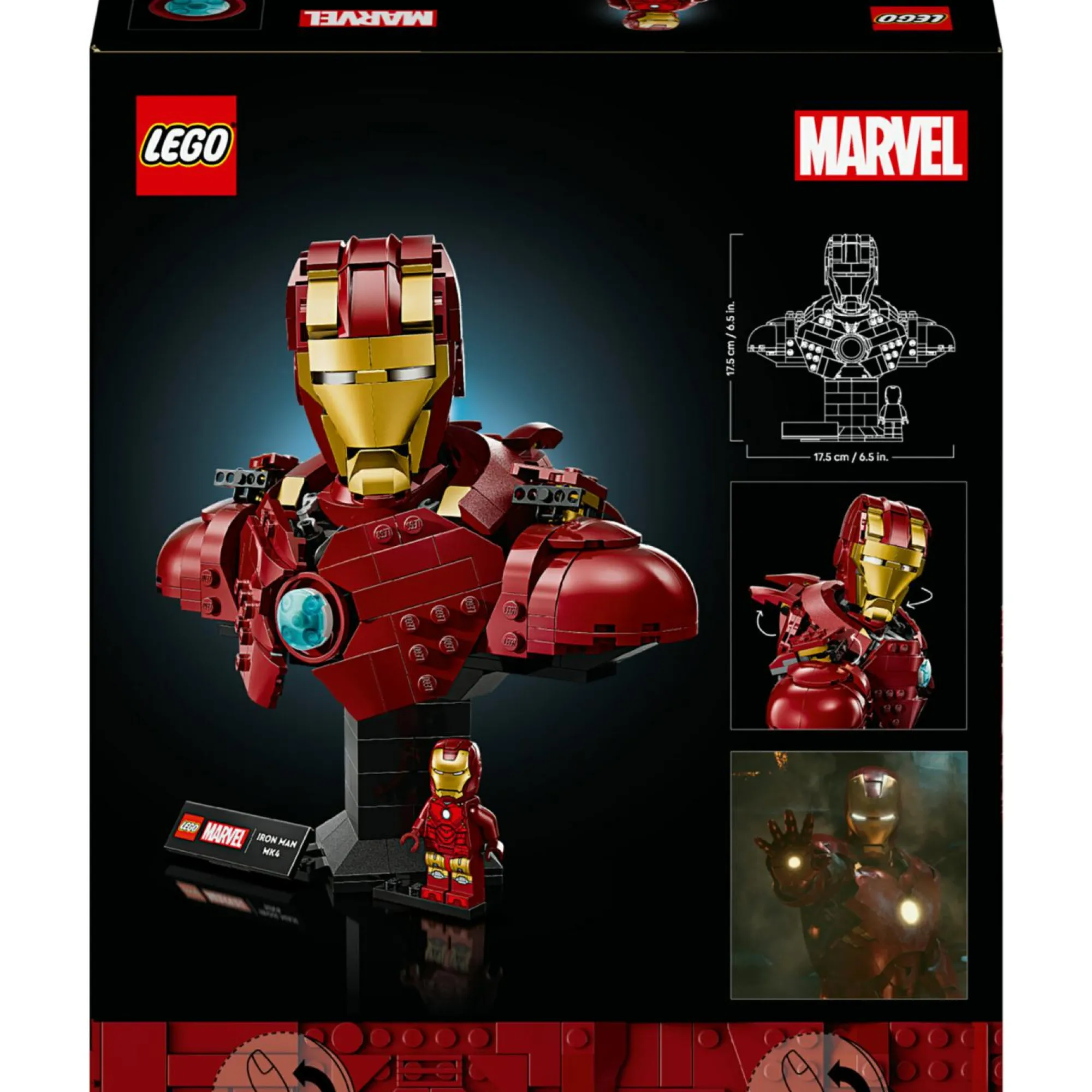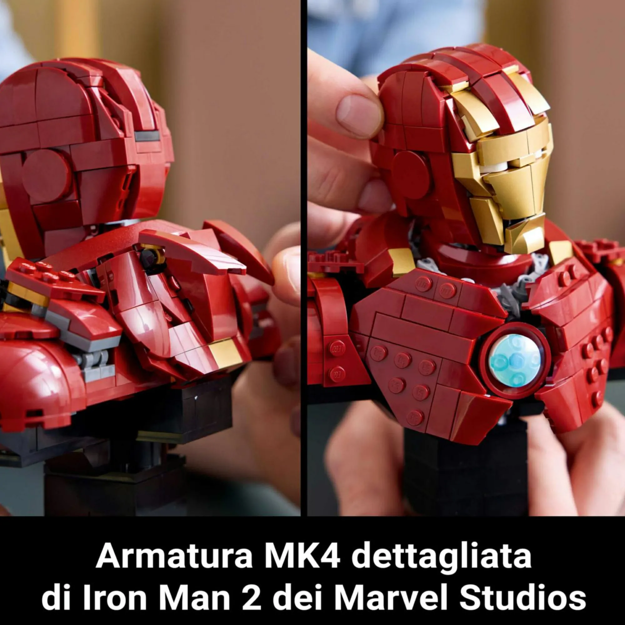 Personaggio di Iron Man LEGO Marvel per adulti: il kit di modellismo in mattoncini Busto di Iron Man MK4 è un set LEGO da collezione, da costruire e da esporre, pensato per i modellisti esperti e per gli appassionati di supereroi Marvel