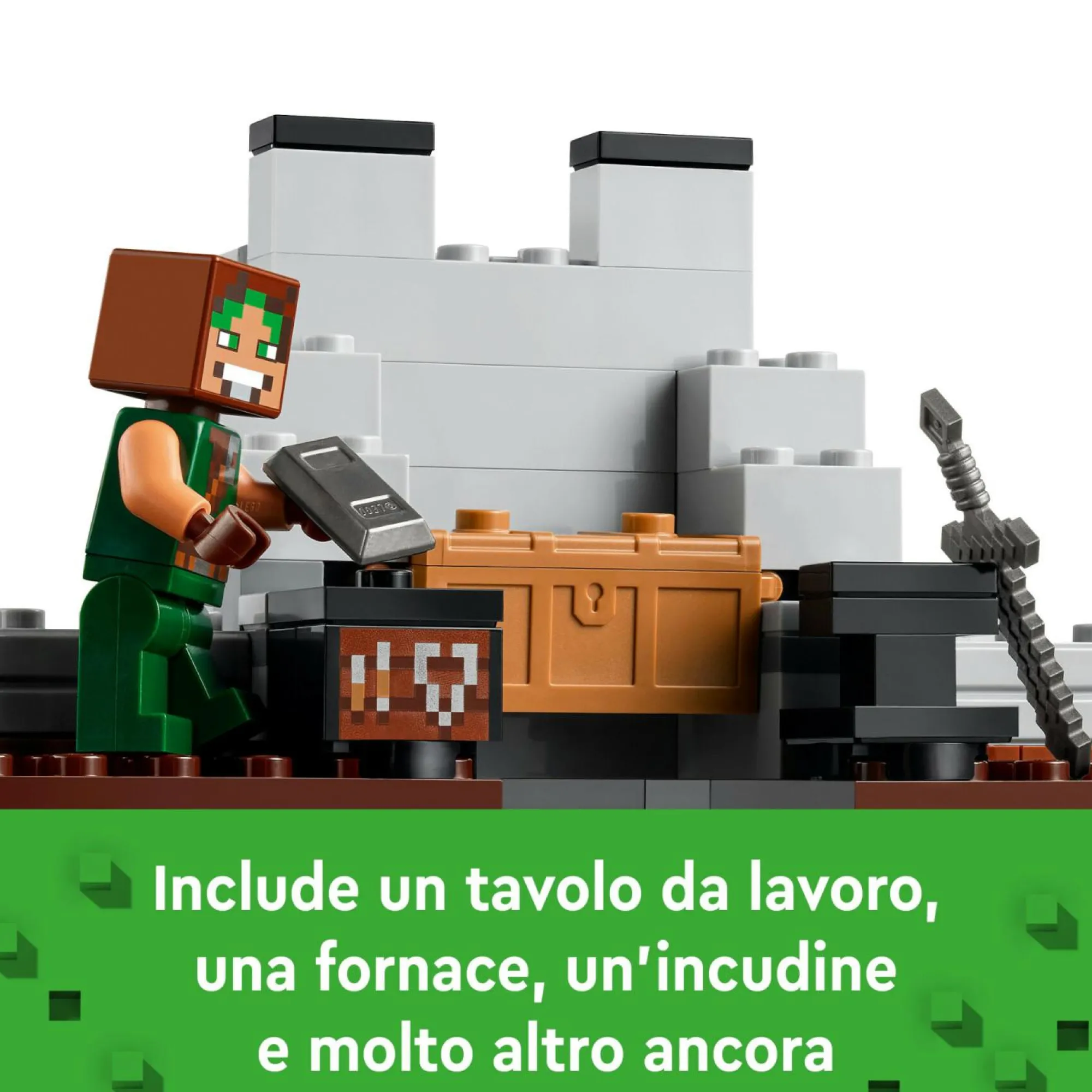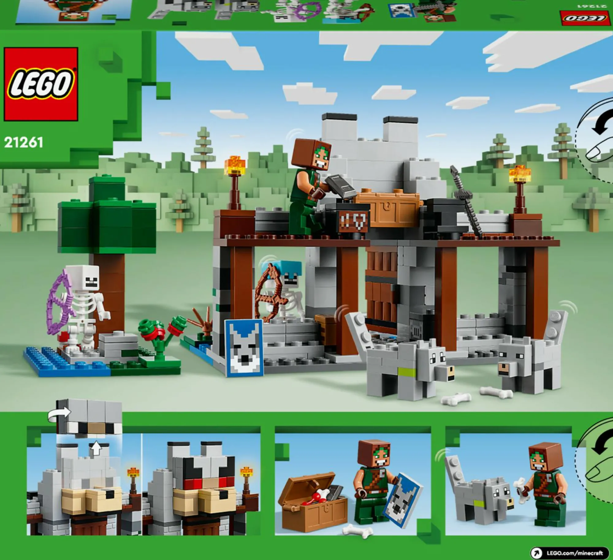 Set di giochi creativi con castello LEGO da costruire per bambini: il set include un banco da lavoro, una fornace, un’incudine e un banco da fabbro, oltre al personaggio del Domatore di lupi LEGO Minecraft, 2 scheletri e 2 lupi