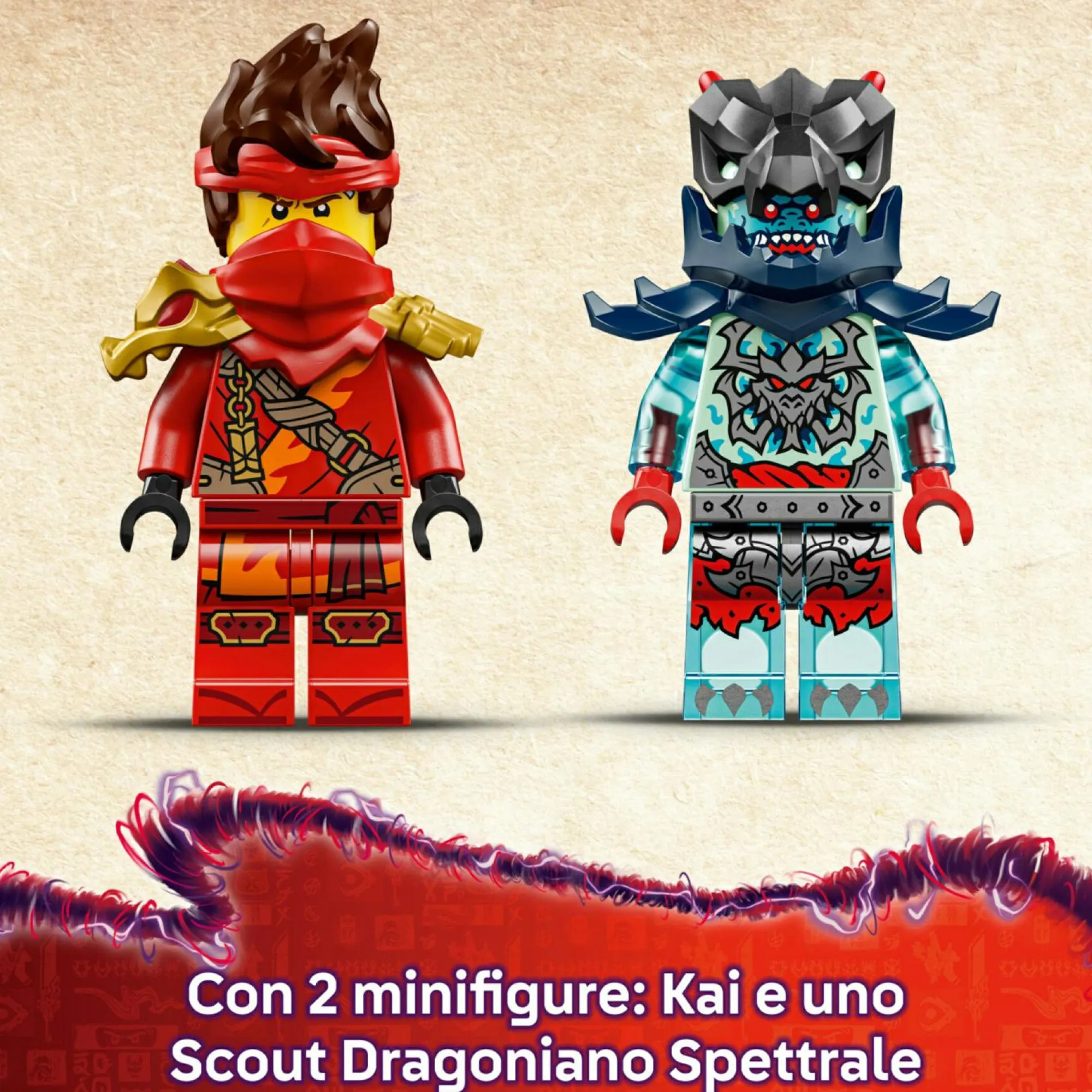 Comprende 2 minifigure LEGO: questo gioco creativo per le battaglie tra ninja include i personaggi NINJAGO del guerriero ninja Kai e del malvagio Scout dragoniano spettrale, ognuno in sella alla propria moto giocattolo