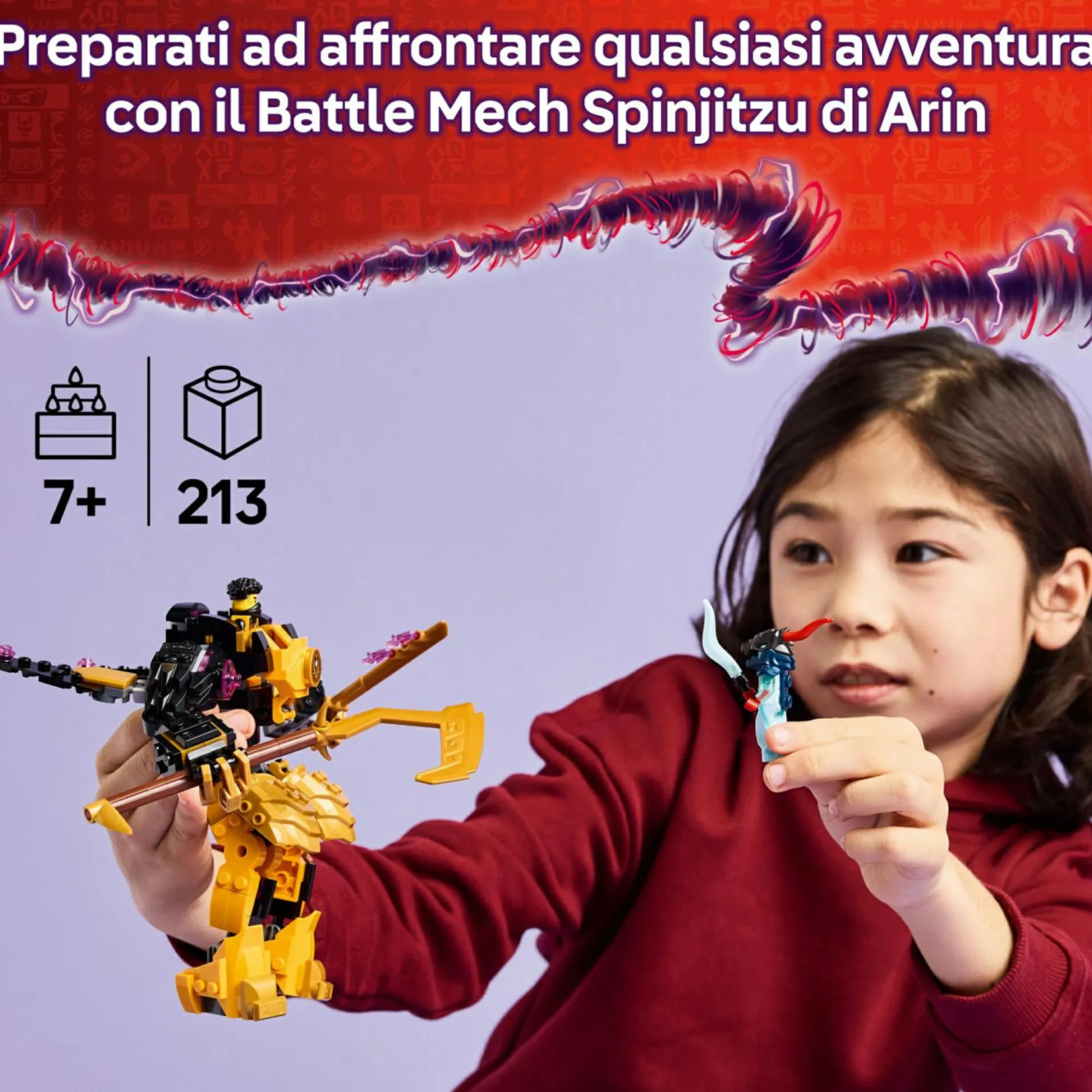 Robot LEGO NINJAGO snodabile: da costruire in mattoncini, il Battle Mech Spinjitzu di Arin è dotato di braccia e gambe snodabili, busto girevole, torace apribile per posizionare una minifigure al suo interno, e 2 grandi spade giocattolo