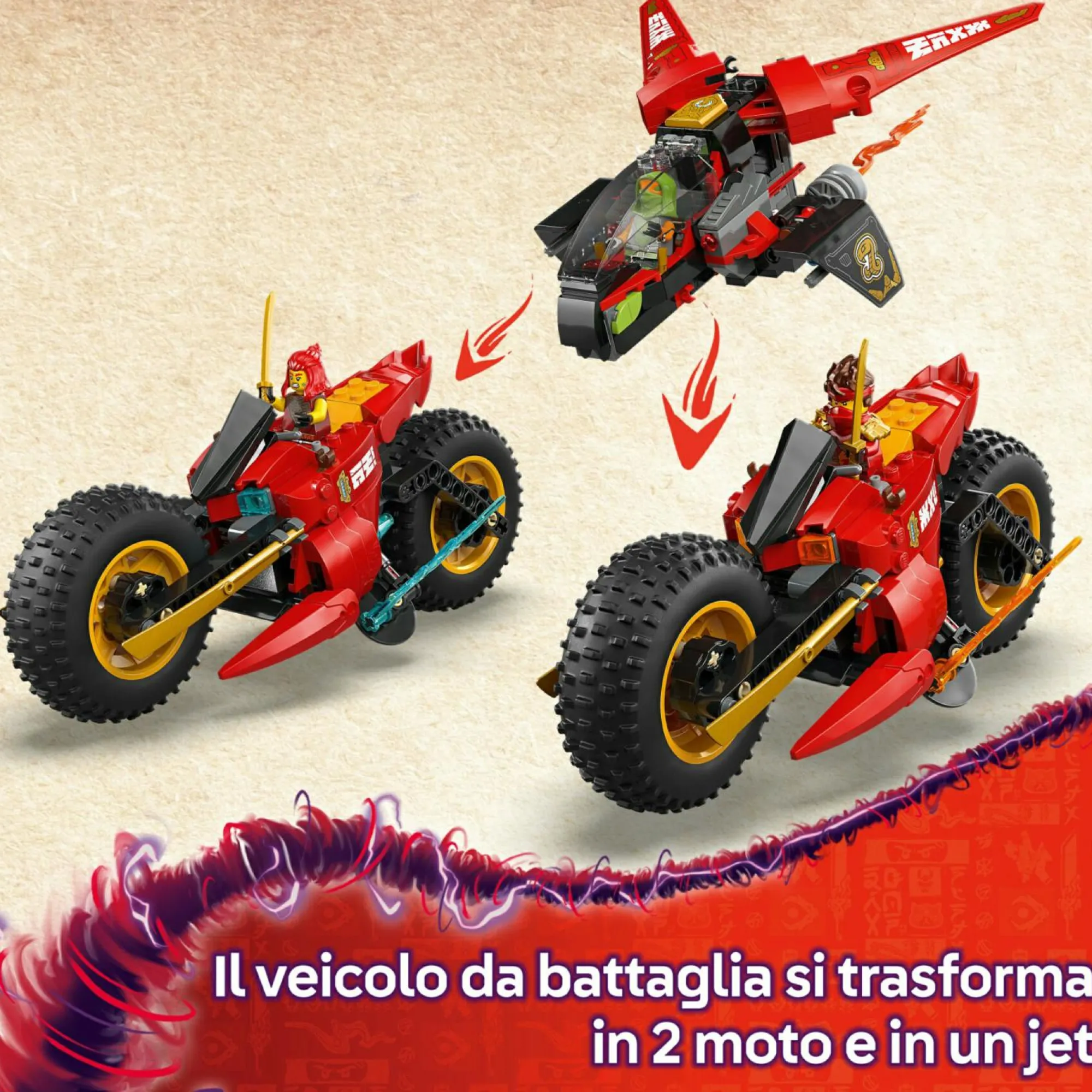 Veicoli giocattolo rimovibili: la grande moto LEGO NINJAGO può essere suddivisa in 3 mezzi: la moto giocattolo di Kai, la moto ninja di Wyldfyre e il jet aereo giocattolo di Frak, dotato di 2 shooter