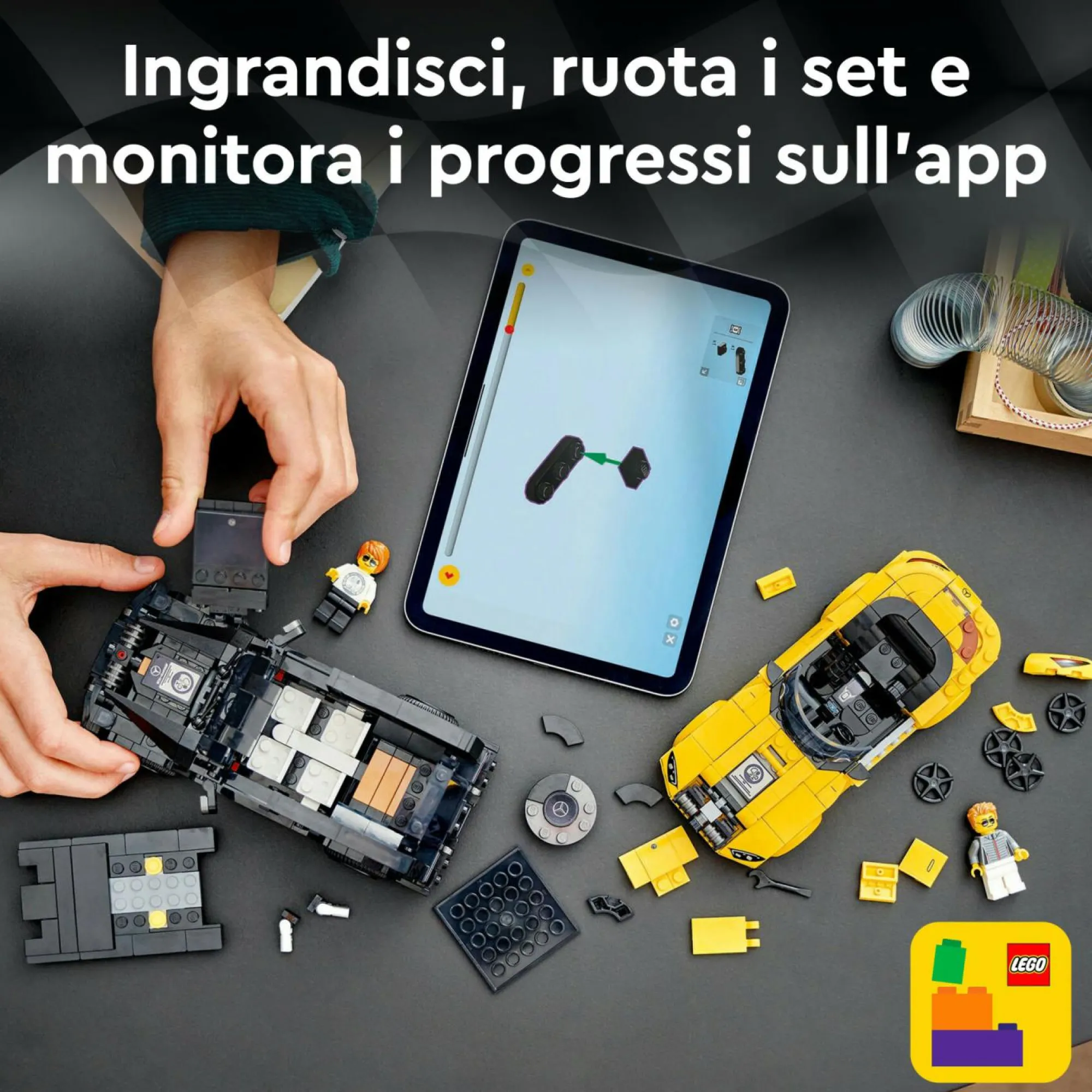 2 minifigure di pilota: ogni veicolo giocattolo include una minifigure del pilota che indossa una tuta Mercedes-AMG, per offrire l’opportunità ai bambini di mettere in scena gare avvincenti con le auto da corsa