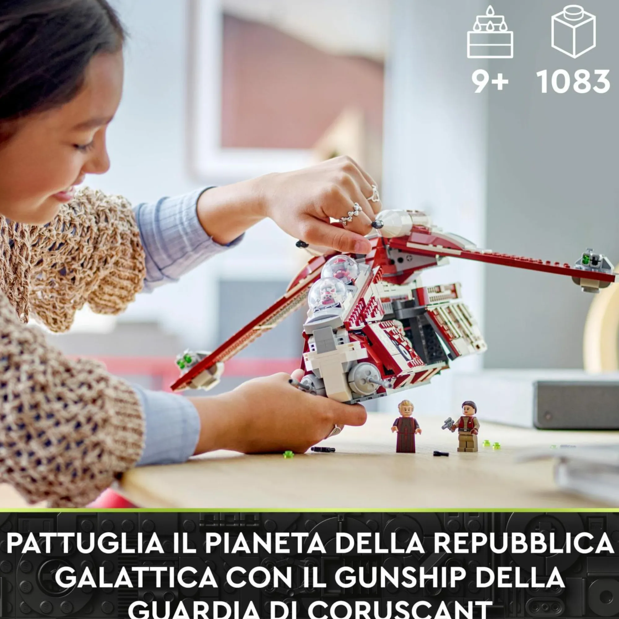Trasporta le truppe d’assalto d’élite e ricrea le storie di Star Wars: Le Guerre dei Cloni, con il set LEGO Star Wars Gunship della Guardia di Coruscant, dotato di un’astronave costruibile e di 5 minifigure