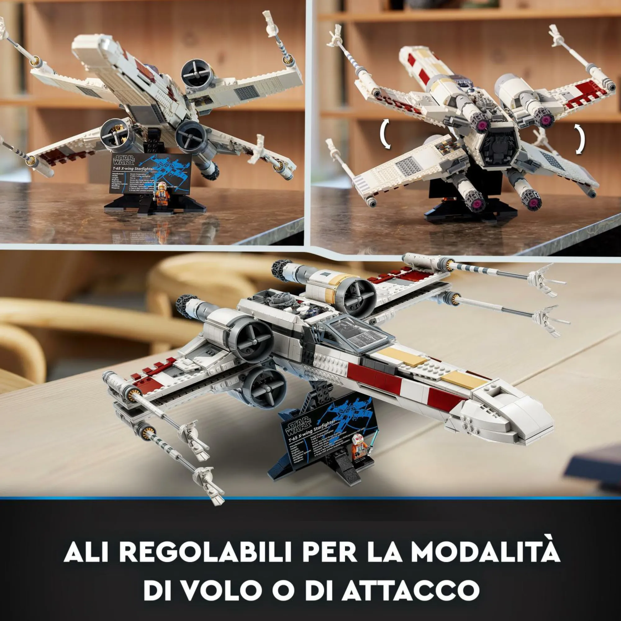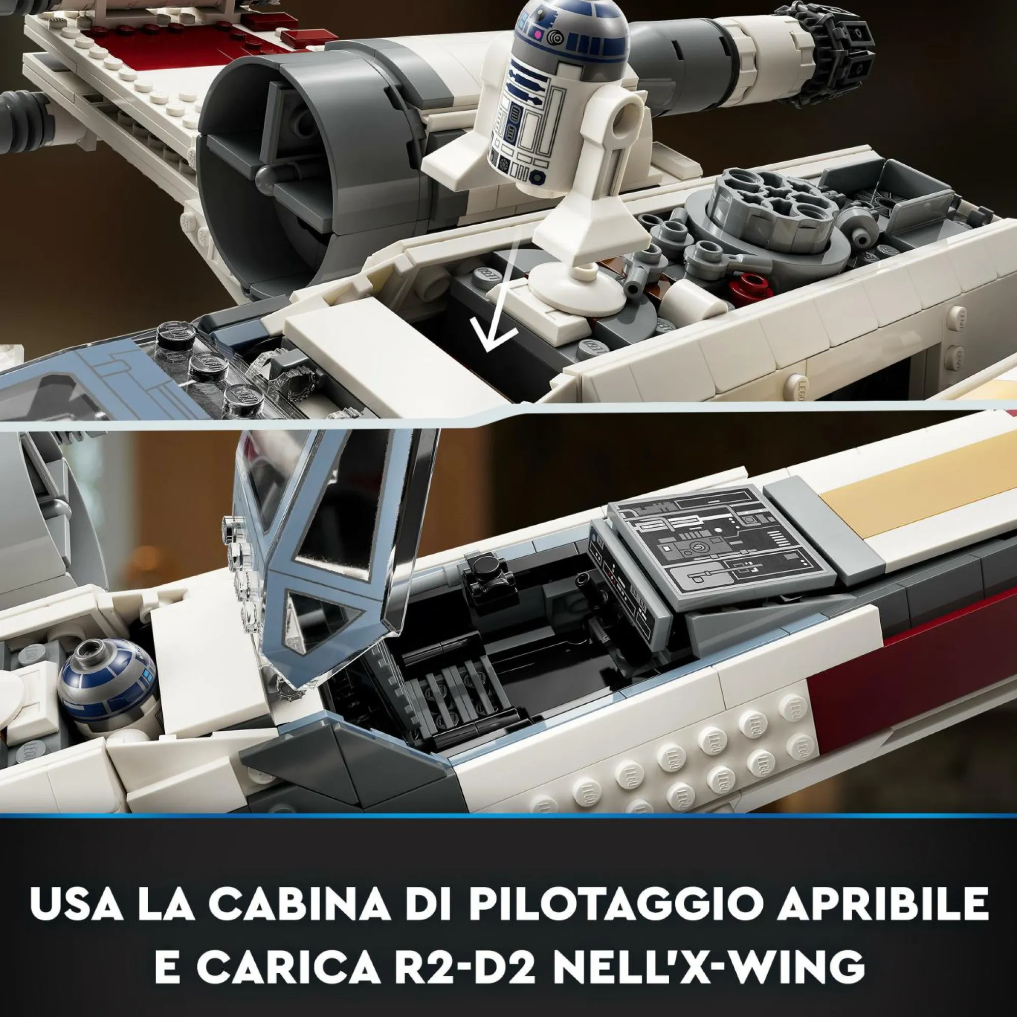 Il modellino di X-Wing Starfighter dispone di cabina apribile, spazio per la figura del droide R2-D2 LEGO e ali regolabili, per passare dalla modalità di volo a quella di attacco usando una manopola
